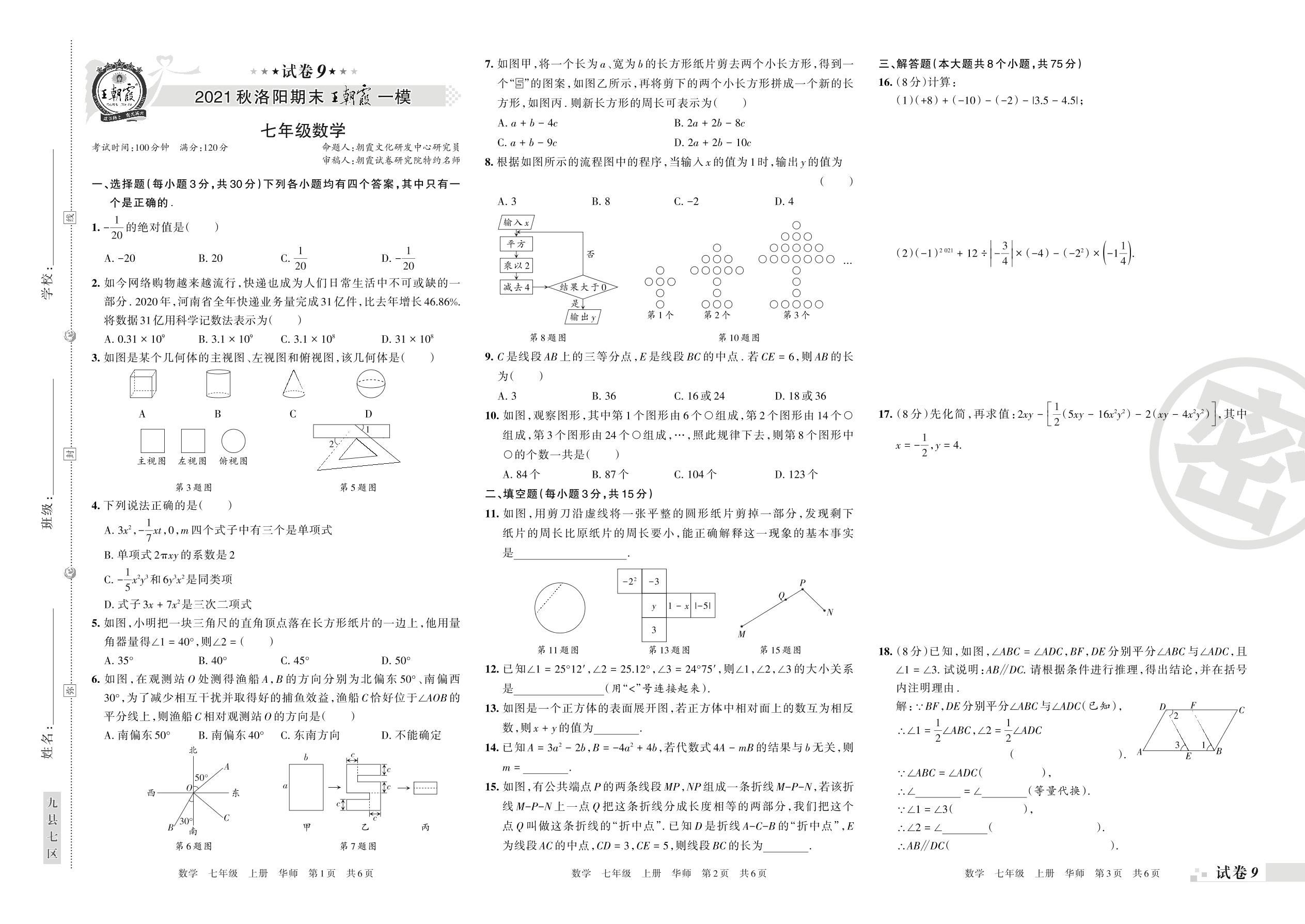 王朝霞期末模拟卷七年级上册数学(华师版)【9】