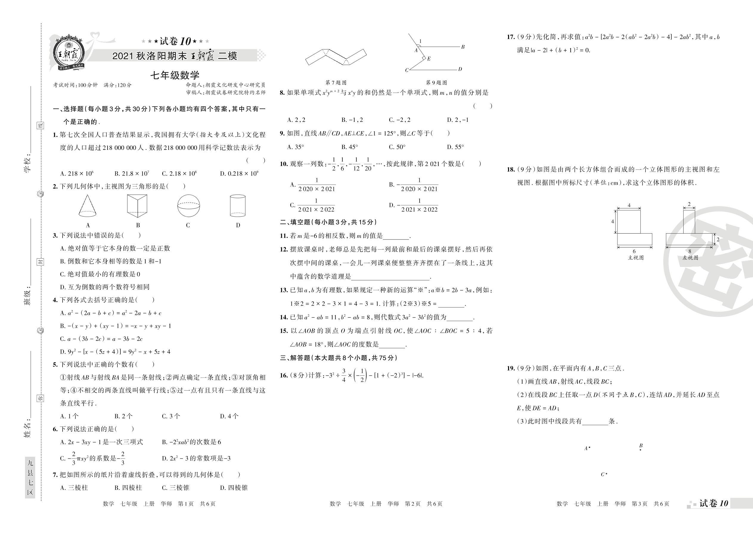 王朝霞期末模拟卷七年级上册数学(华师版)【10】