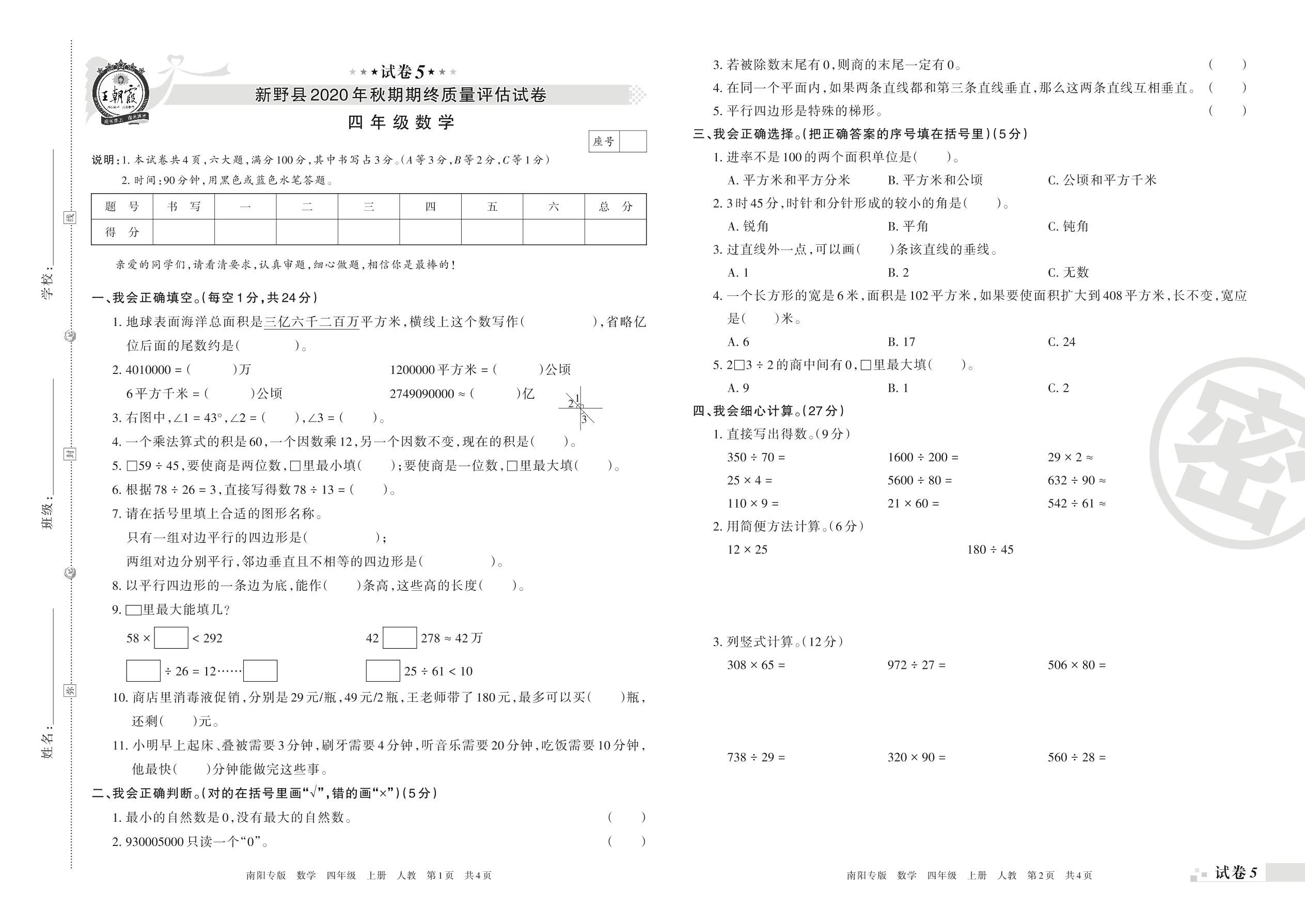 新野县2020年秋期期终质量评估试卷四年级数学(人教版)【5】