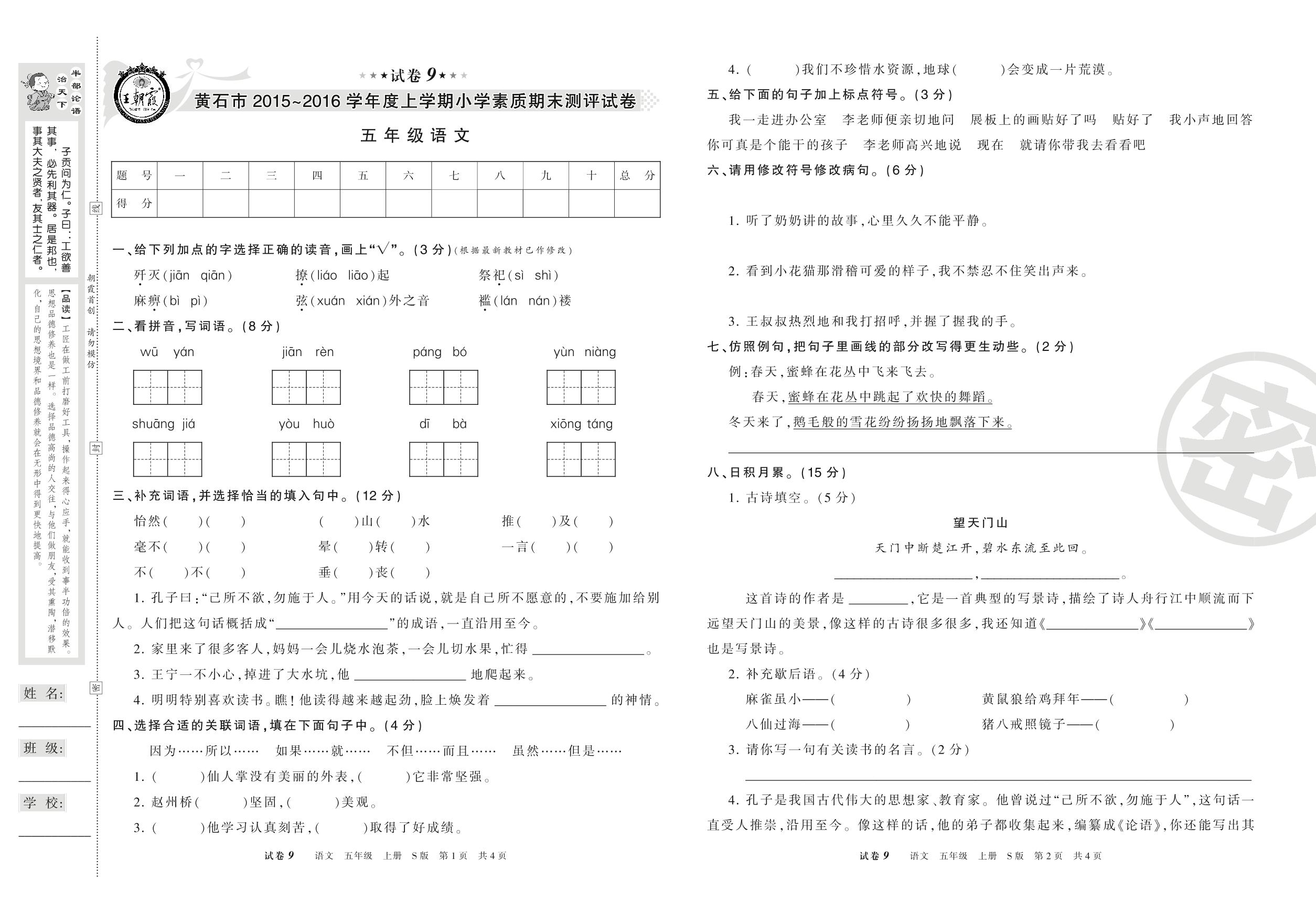 2015-2016学年第一学期黄石市五年级语文试卷(S版)【9】