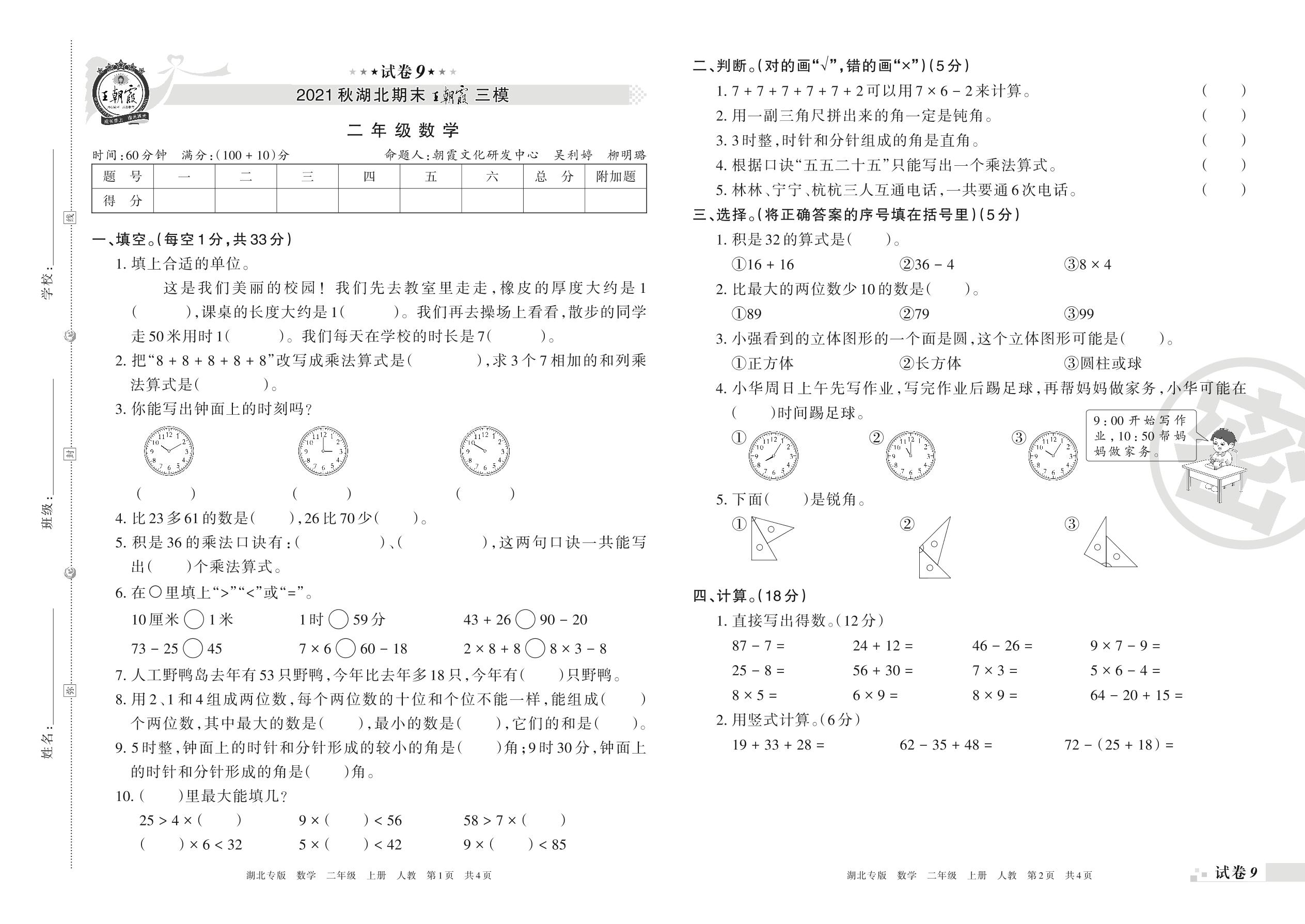 王朝霞期末模拟卷二年级上册数学人教版【9】