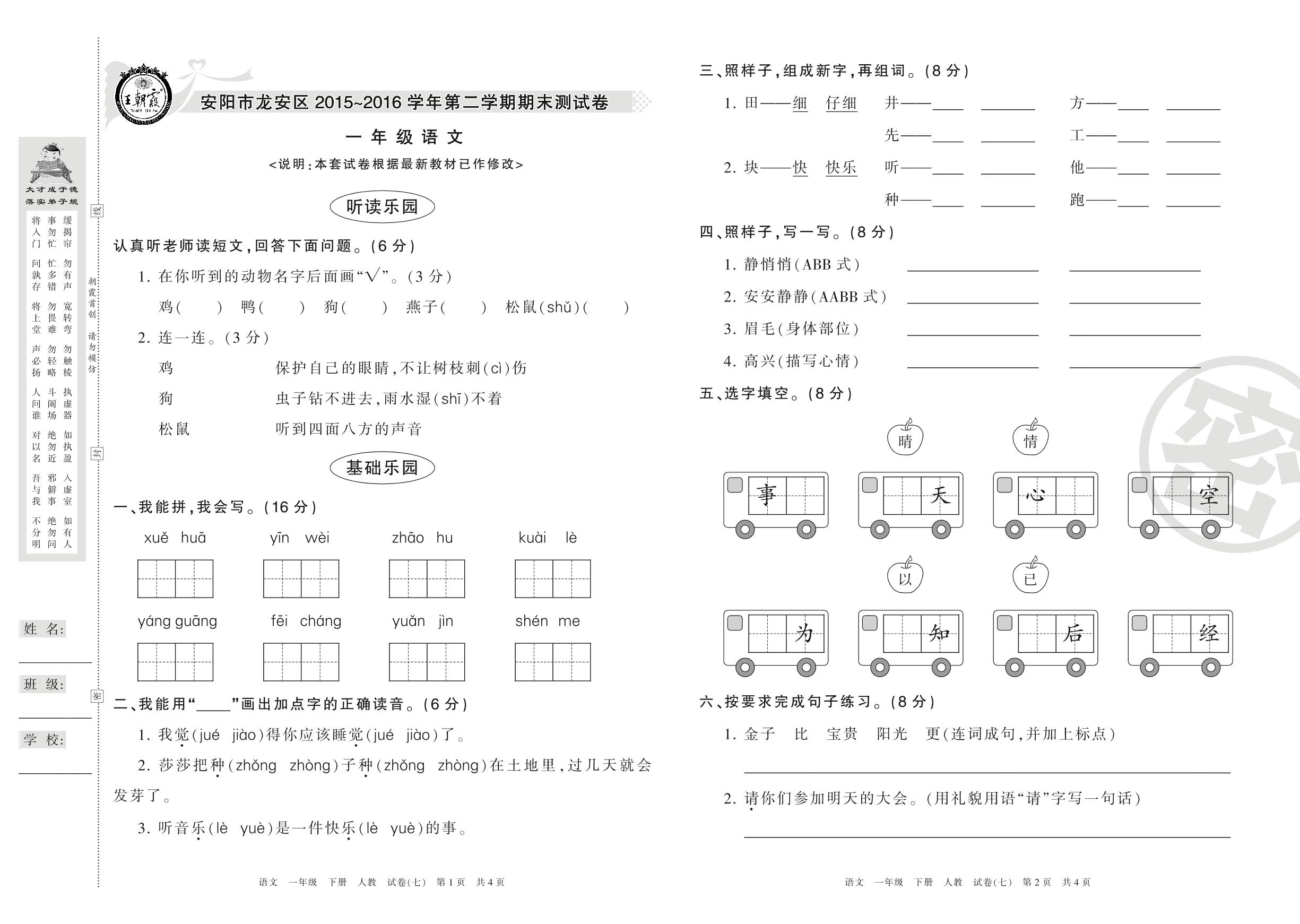 2015-2016学年第二学期安阳市龙安区一年级语文试卷(人教版)【7】