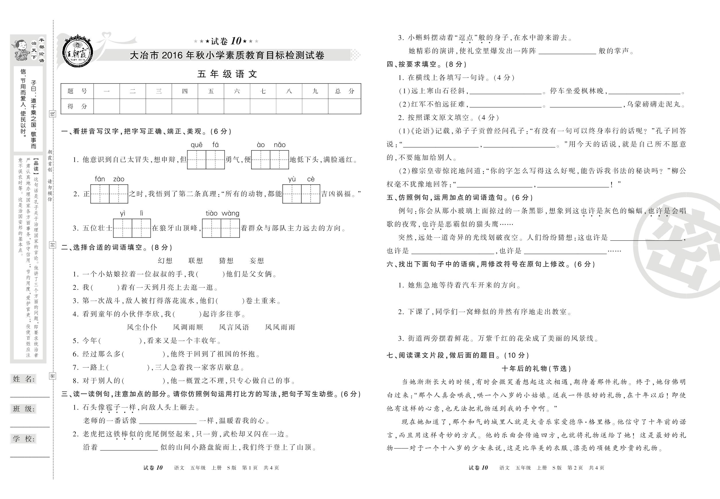 2016-2017学年第一学期大冶市五年级语文试卷(S版)【10】