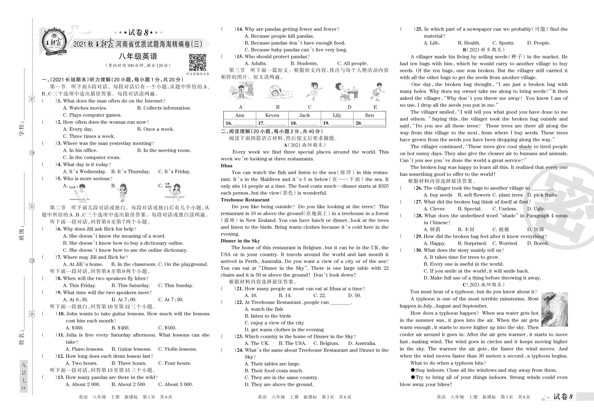 2021秋王朝霞河南省优质试题海淘精编卷(三)八年级英语(新课标版)【8】