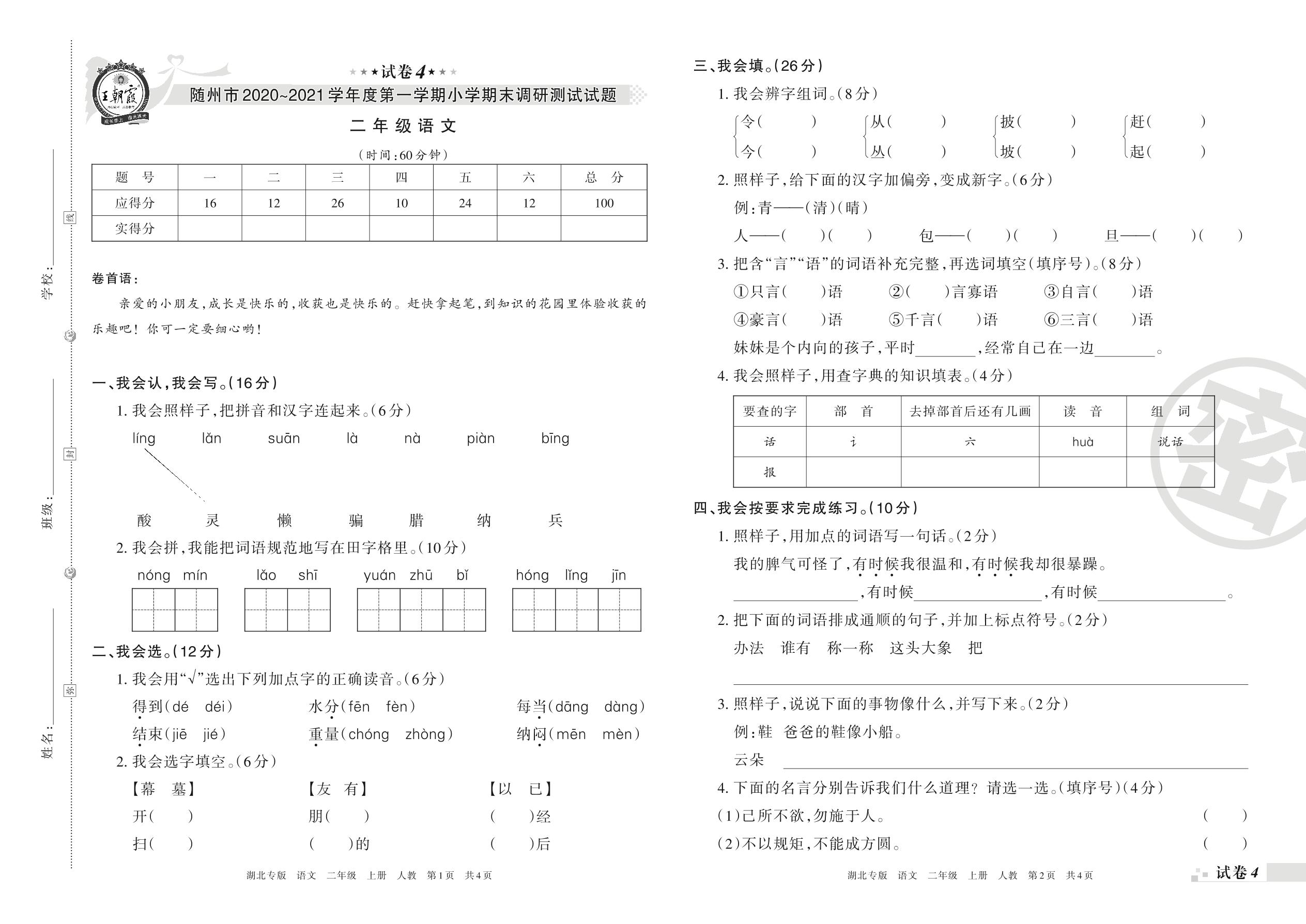 随州市2020~2021学年度第一学期小学期末调研测试试题二年级语文(人教版)【4】