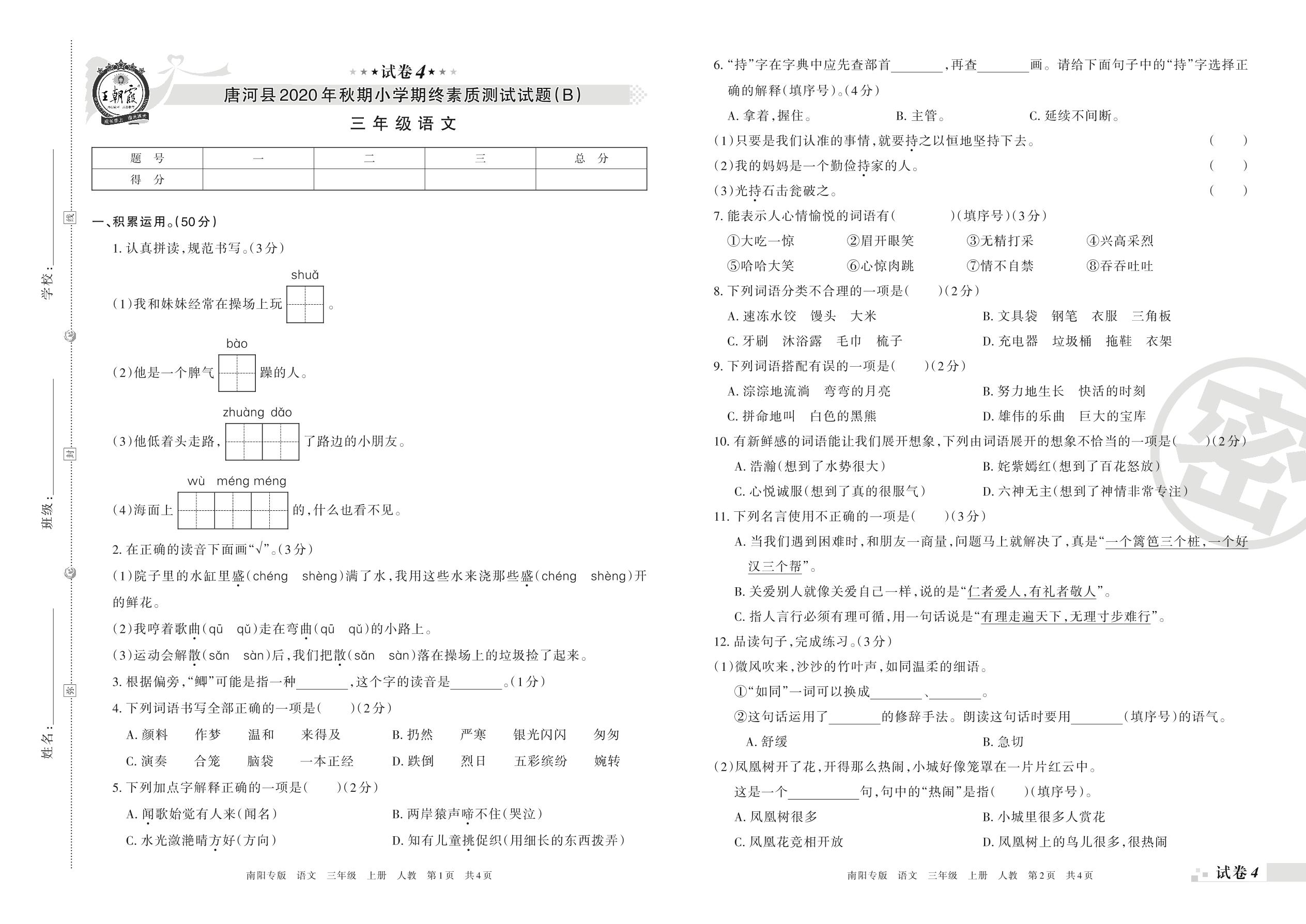 唐河县2020年秋期小学期终素质测试试题(B)三年级语文(人教版)【4】
