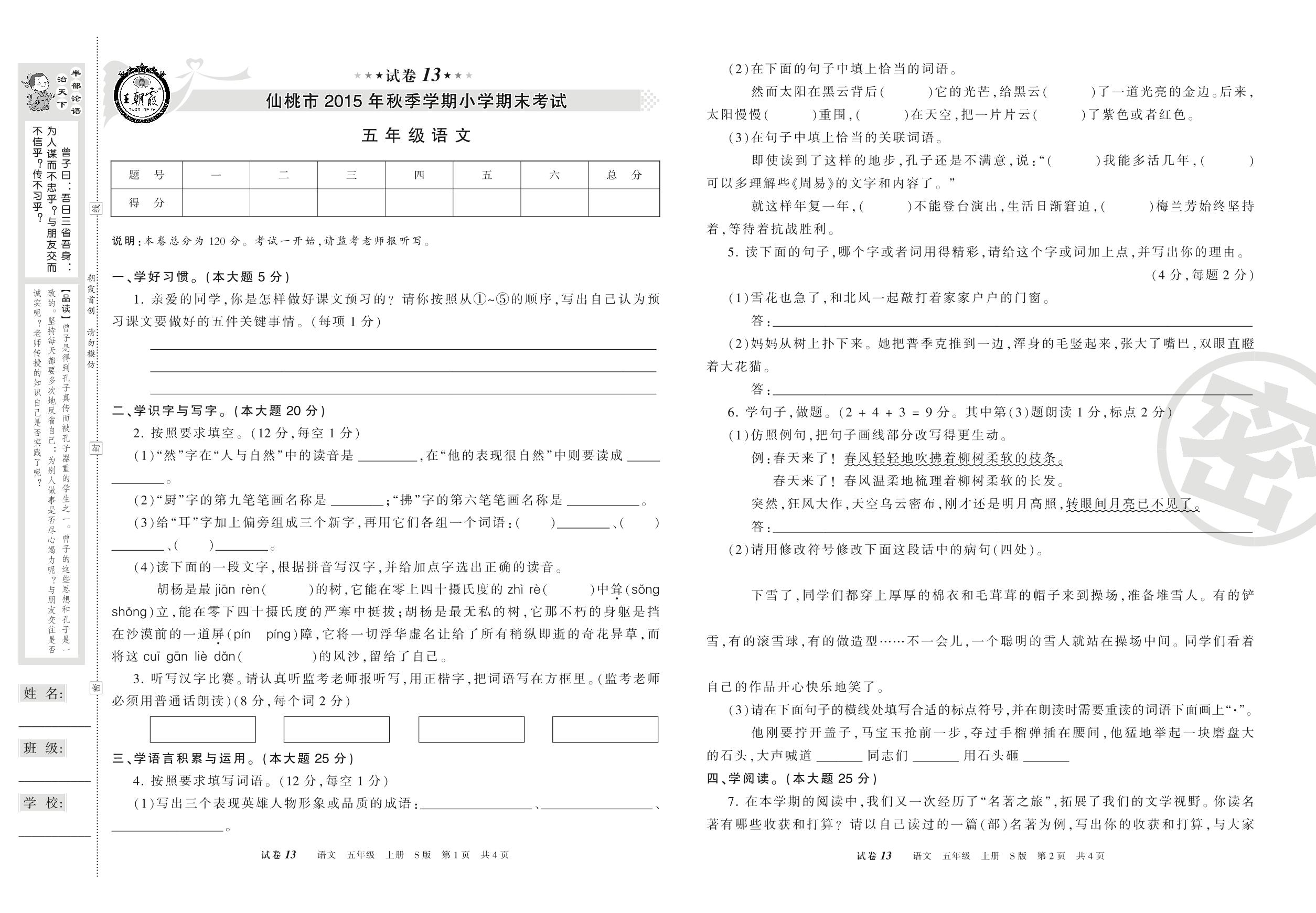 2015-2016学年第一学期仙桃市五年级语文试卷(S版)【13】