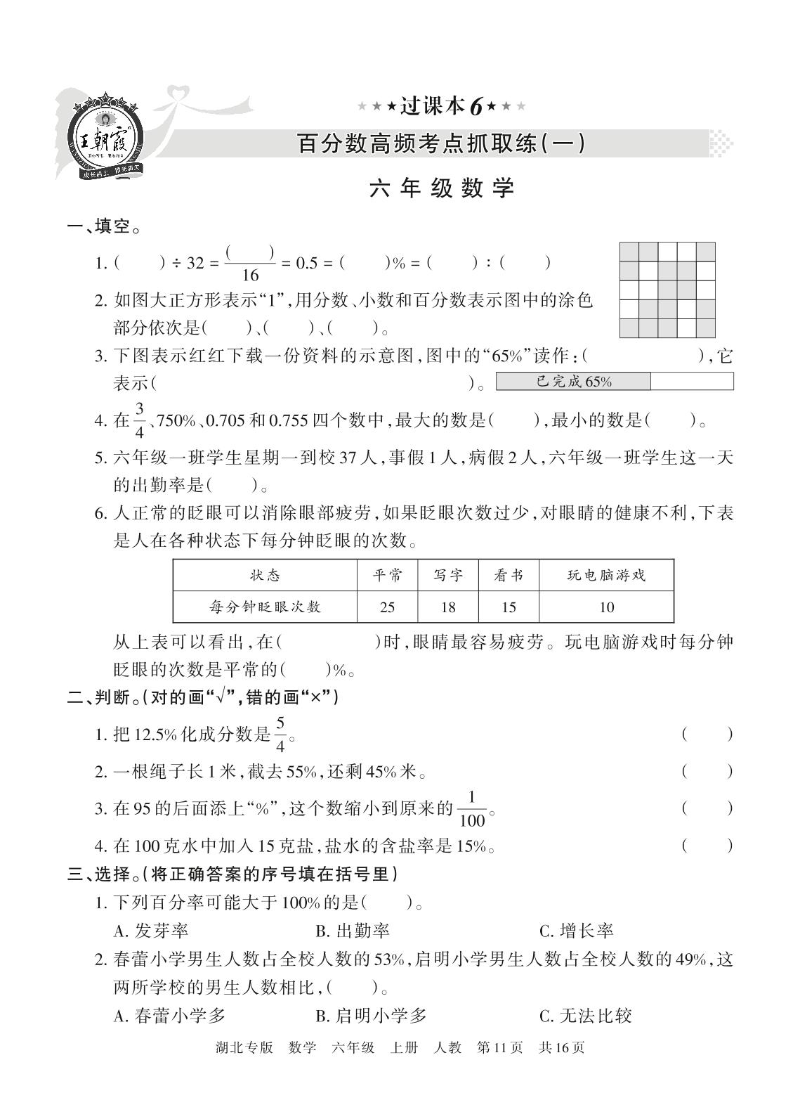 王朝霞期末过课本——百分数高频考点抓取练(一)六年级上册数学人教版【6】