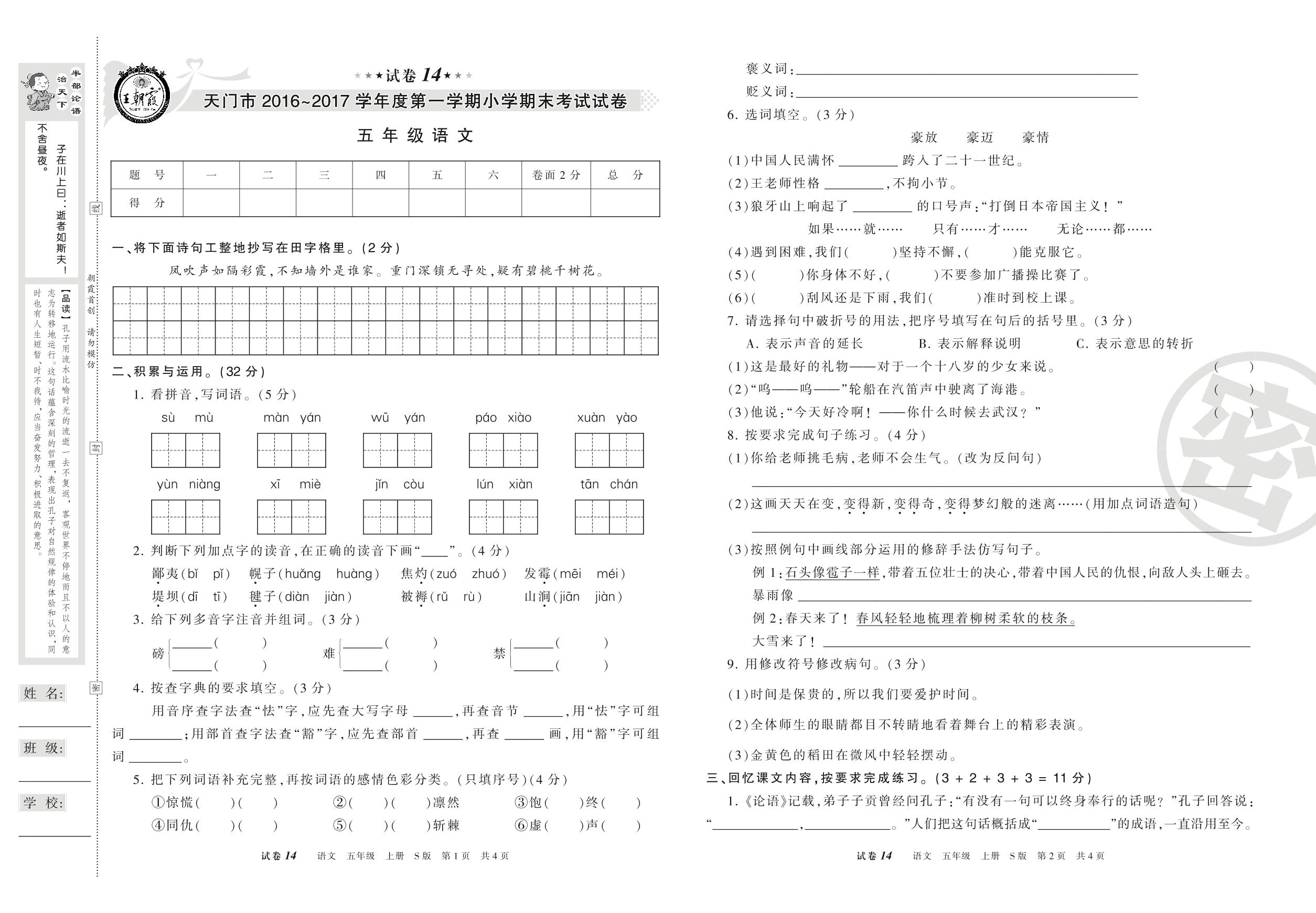 2016-2017学年第一学期天门市五年级语文试卷(S版)【14】
