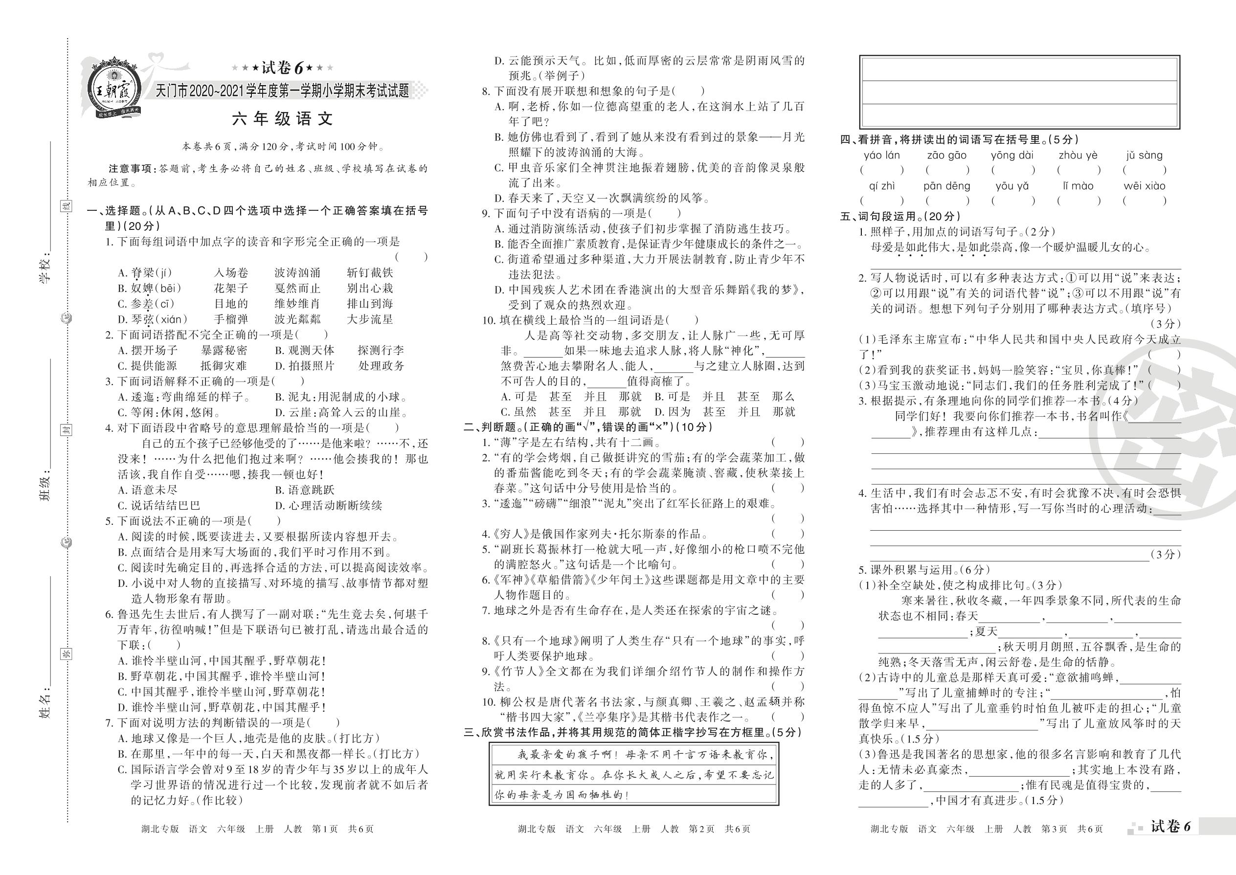 天门市2020~2021学年度第一学期小学期末考试试题六年级语文(人教版)【6】
