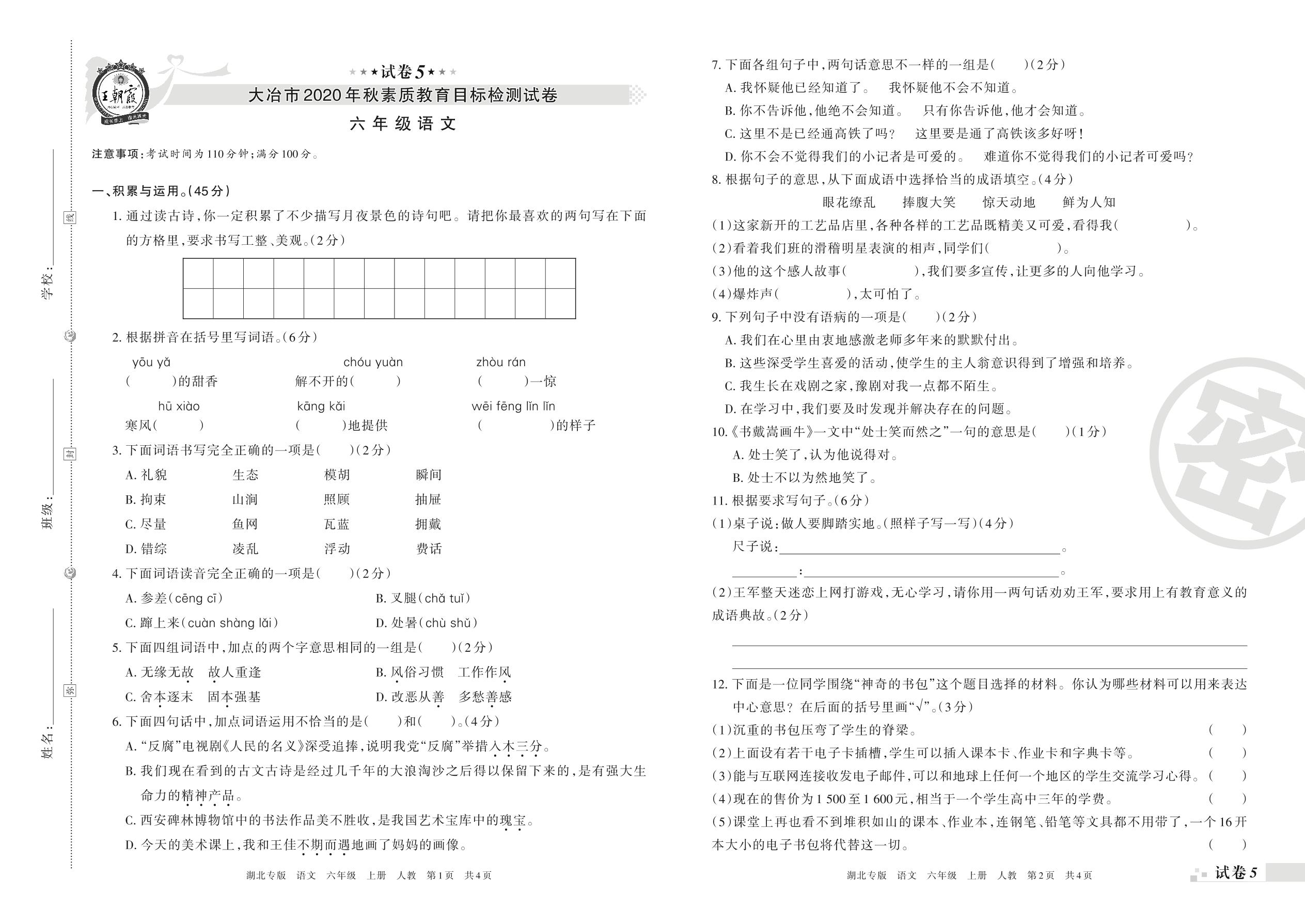 大冶市2020年秋素质教育目标检测试卷六年级语文(人教版)【5】