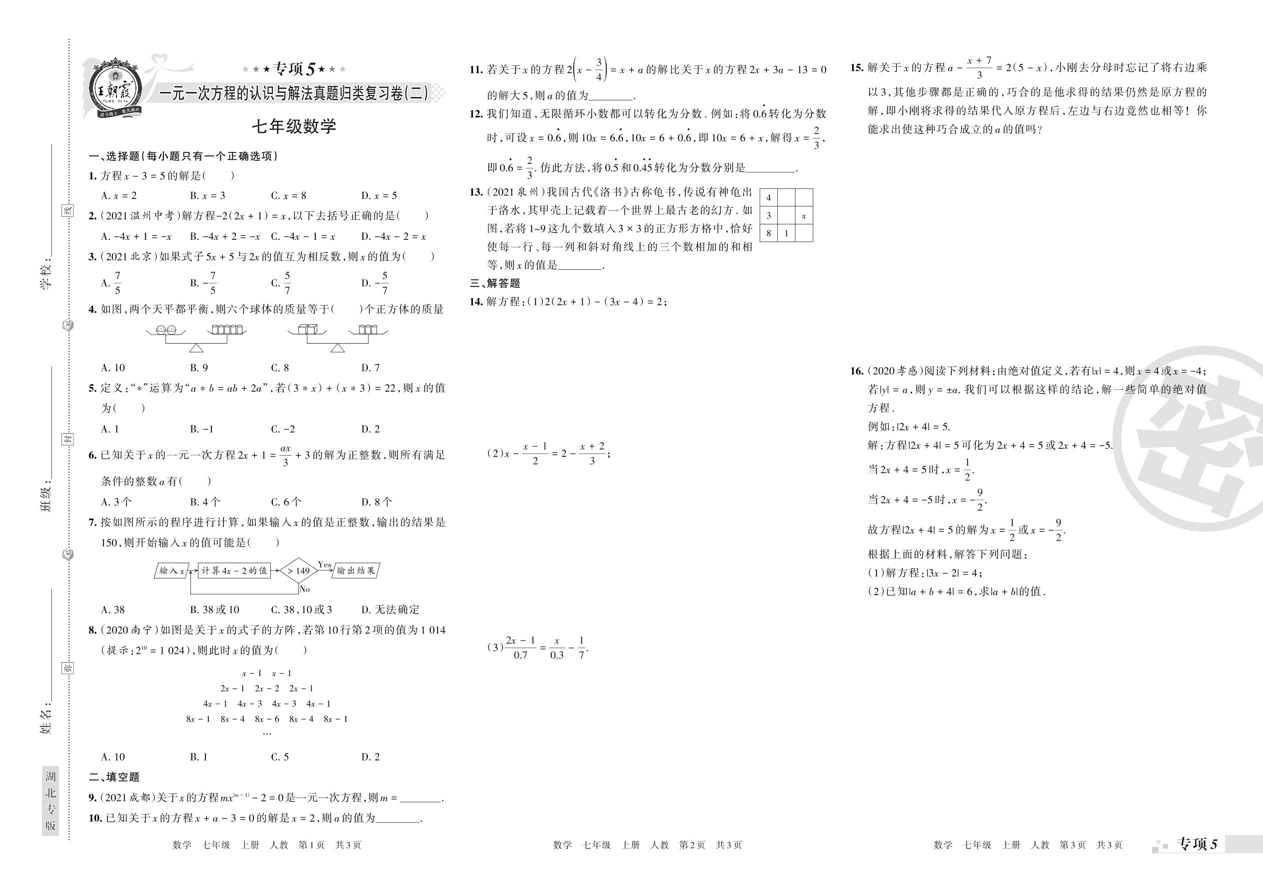 王朝霞期末专项卷——一元一次方程的认识与解法真题归类复习卷(二)七年级上册数学(人教版)_R211224164636073【5】