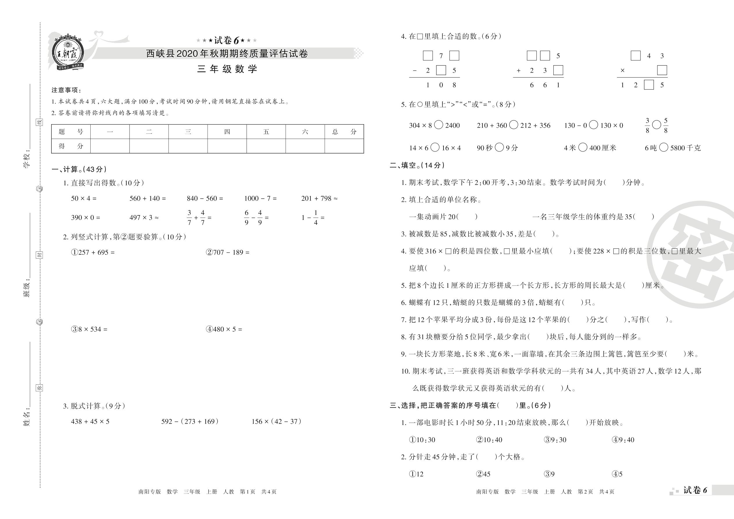 西峡县2020年秋期期终质量评估试卷三年级数学(人教版)【6】