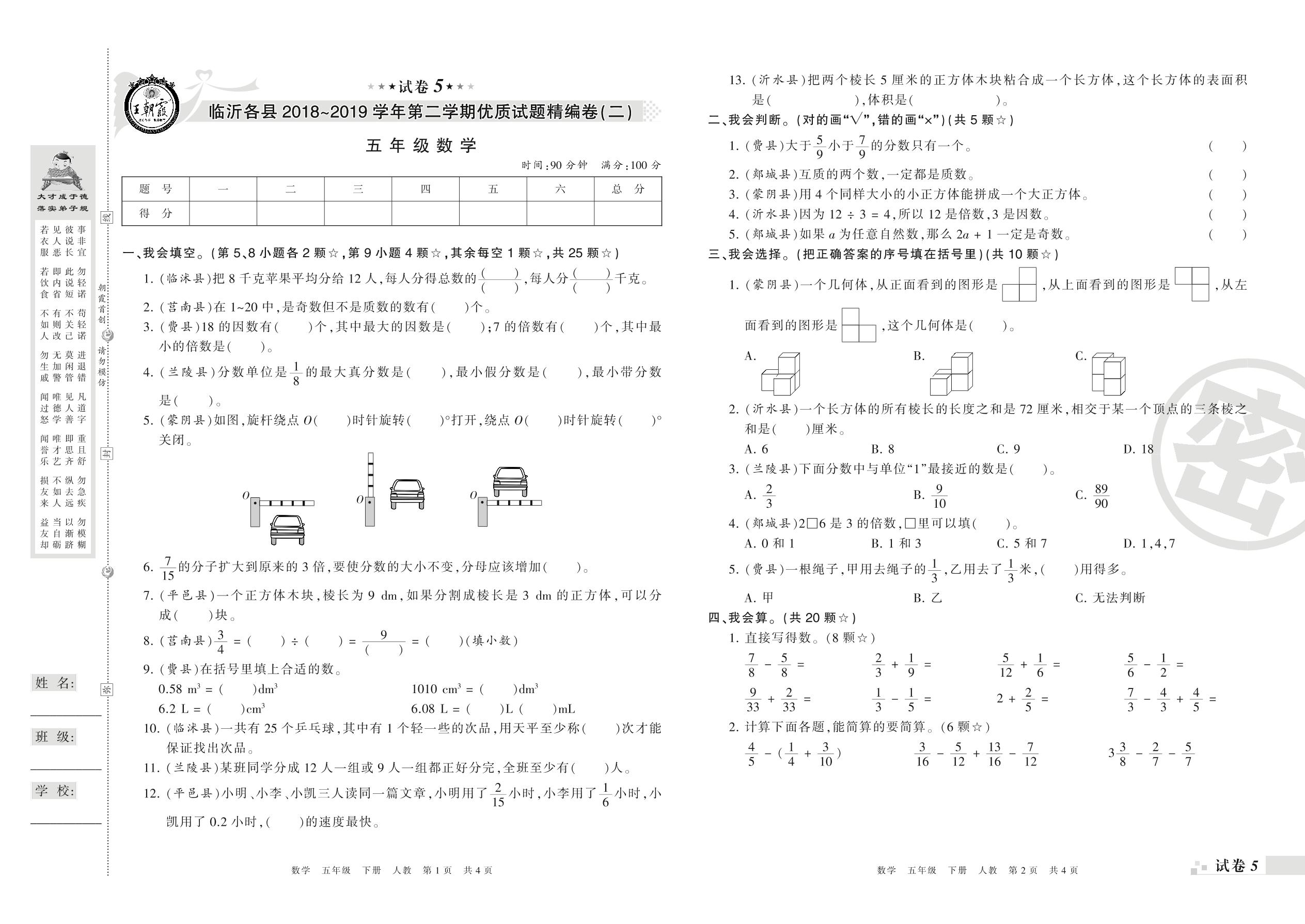 临沂各县优质试题精编卷(二)五年级下册数学(人教版)【5】