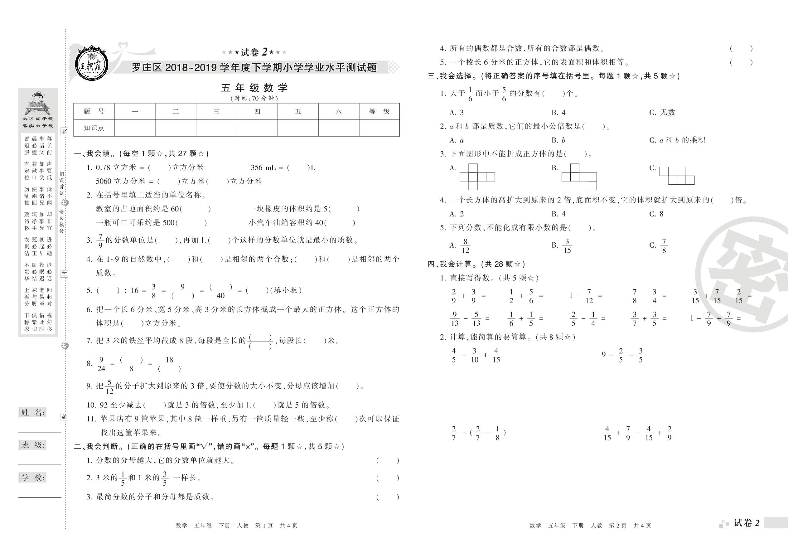 2018-2019学年第二学期临沂市罗庄区五年级数学试卷(人教版)【2】