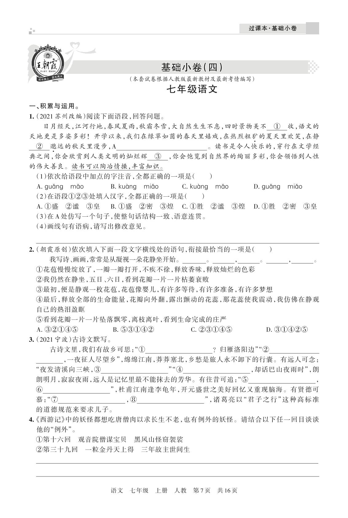 王朝霞期末过课本——基础小卷(四)七年级上册语文(人教版)_R211224170514239【10】