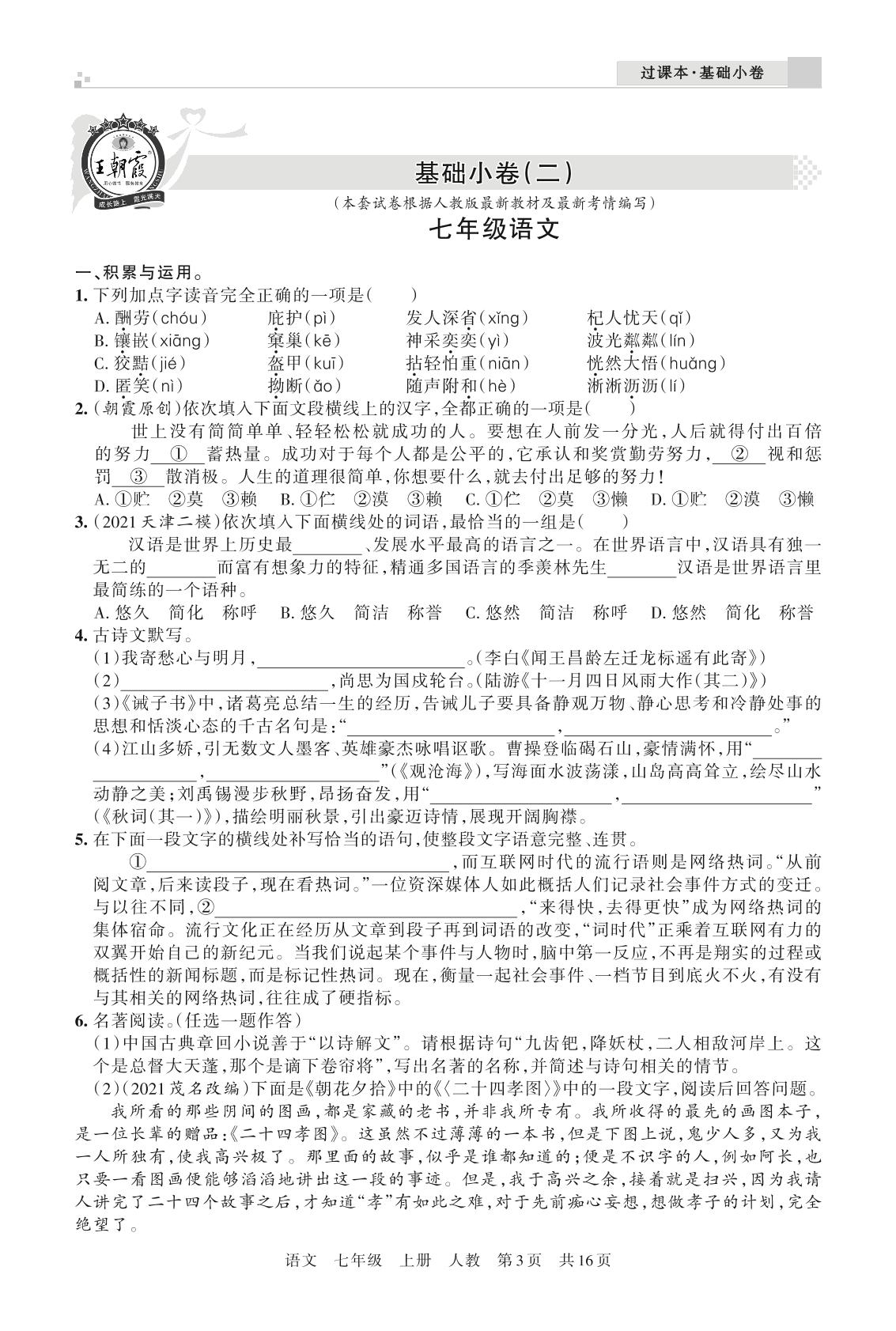 王朝霞期末过课本——基础小卷(二)七年级上册语文(人教版)_R211224170514363【8】
