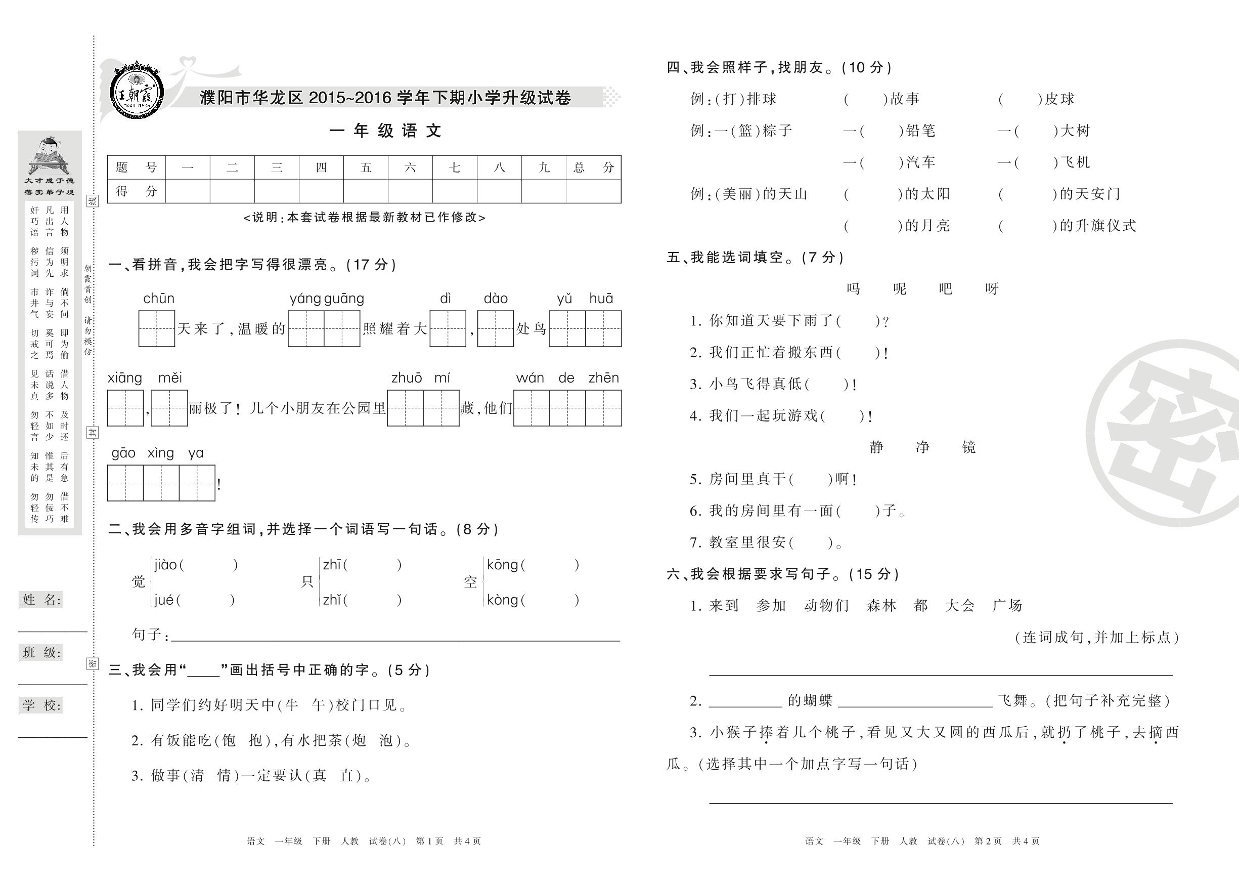 2015-2016学年第二学期濮阳市华龙区一年级语文试卷(人教版)【8】