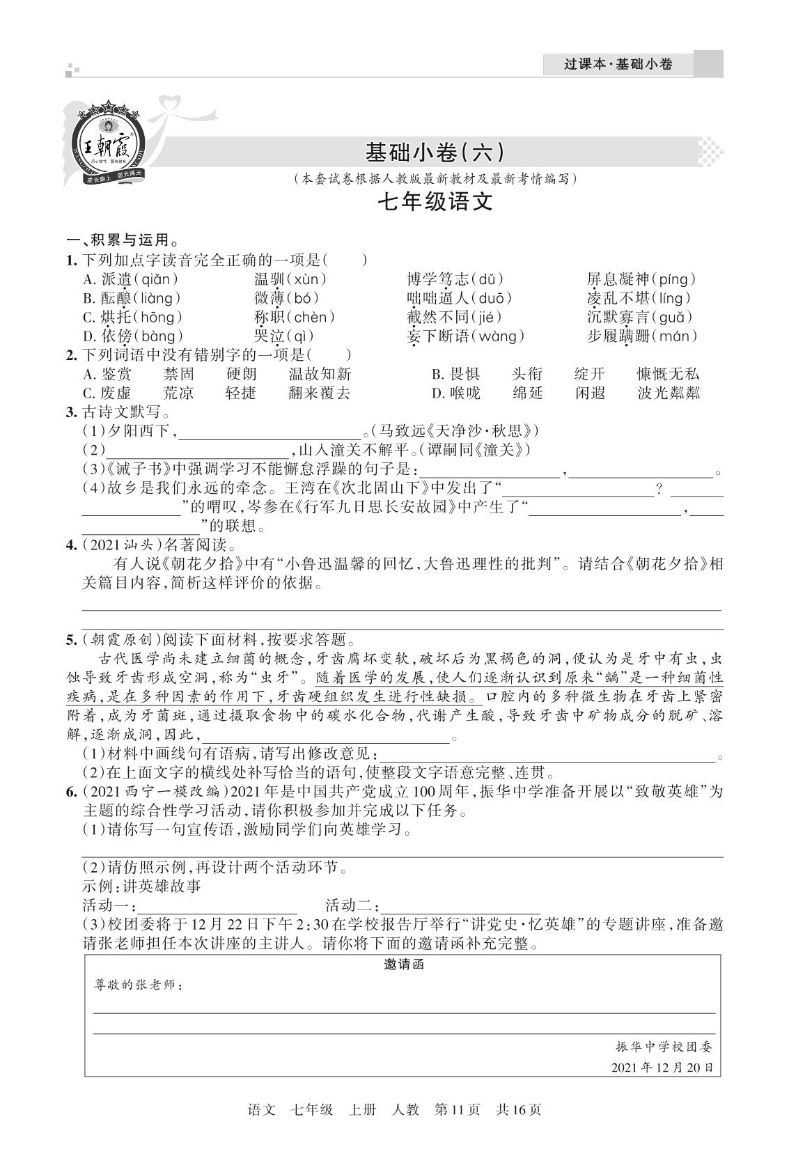 王朝霞期末过课本——基础小卷(六)七年级上册语文(人教版)_R211224170515467【12】