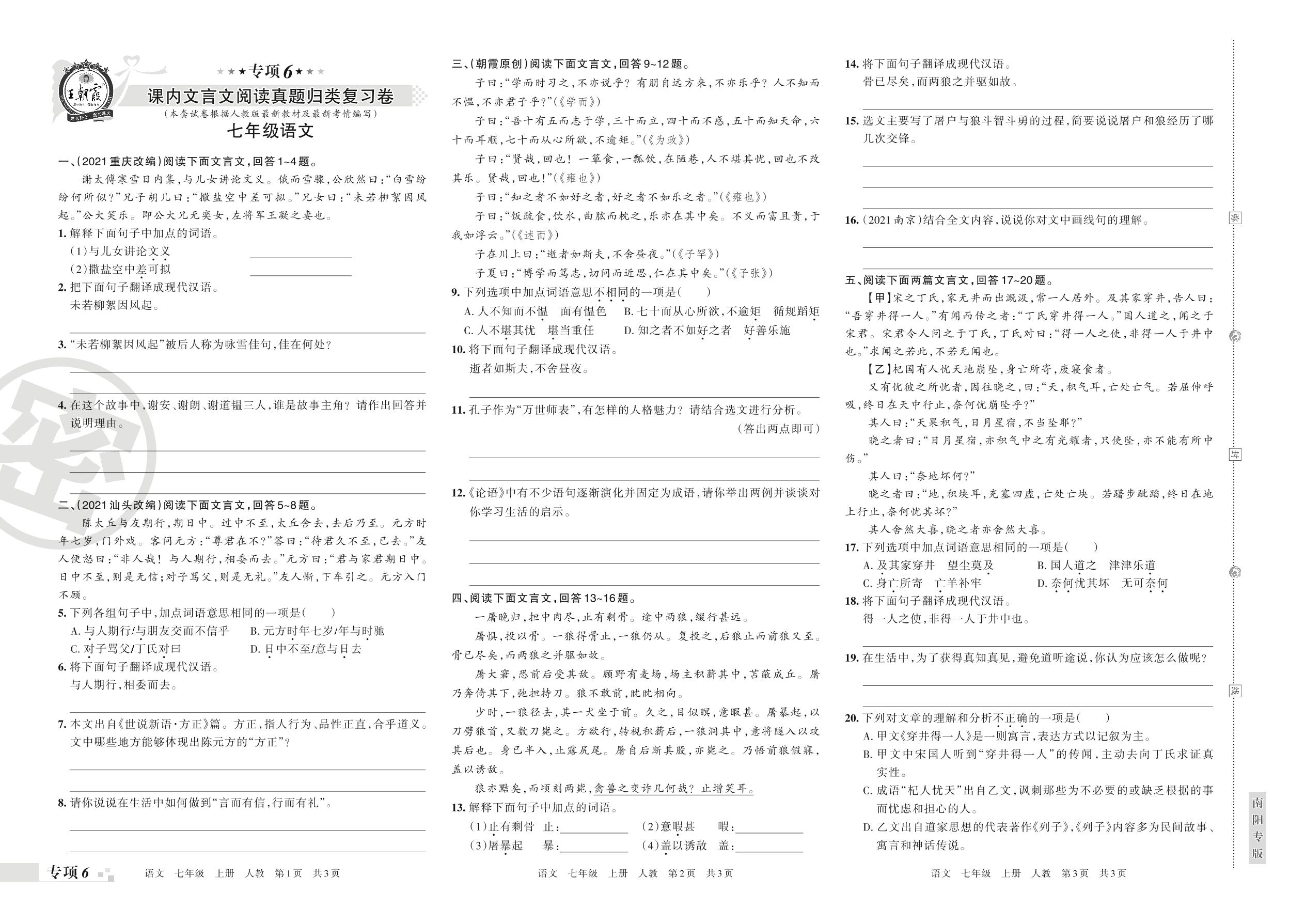 王朝霞期末专项卷——课内文言文阅读真题归类复习卷七年级上册语文(人教版)_R211224170515136【6】
