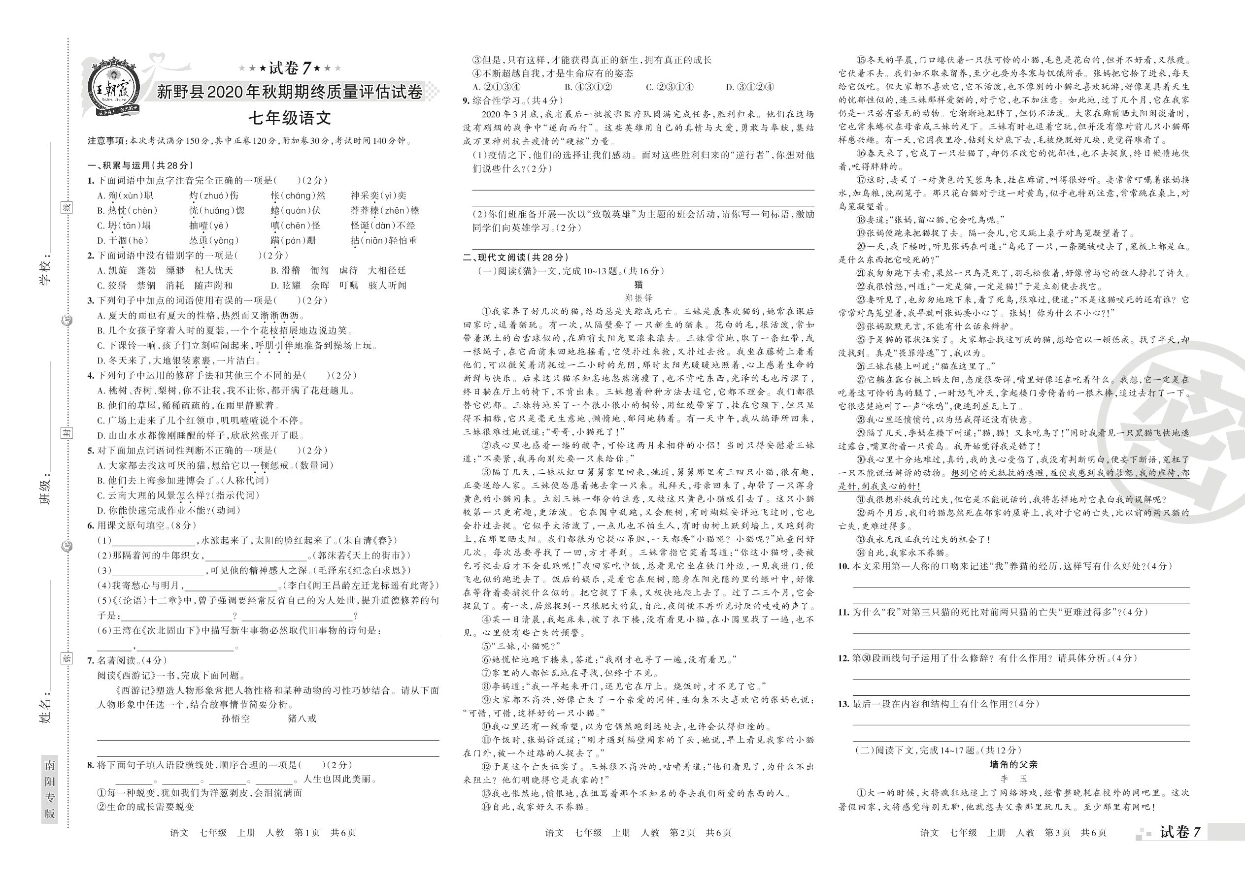 新野县2020年秋期期终质量评估试卷七年级语文(人教版)【7】