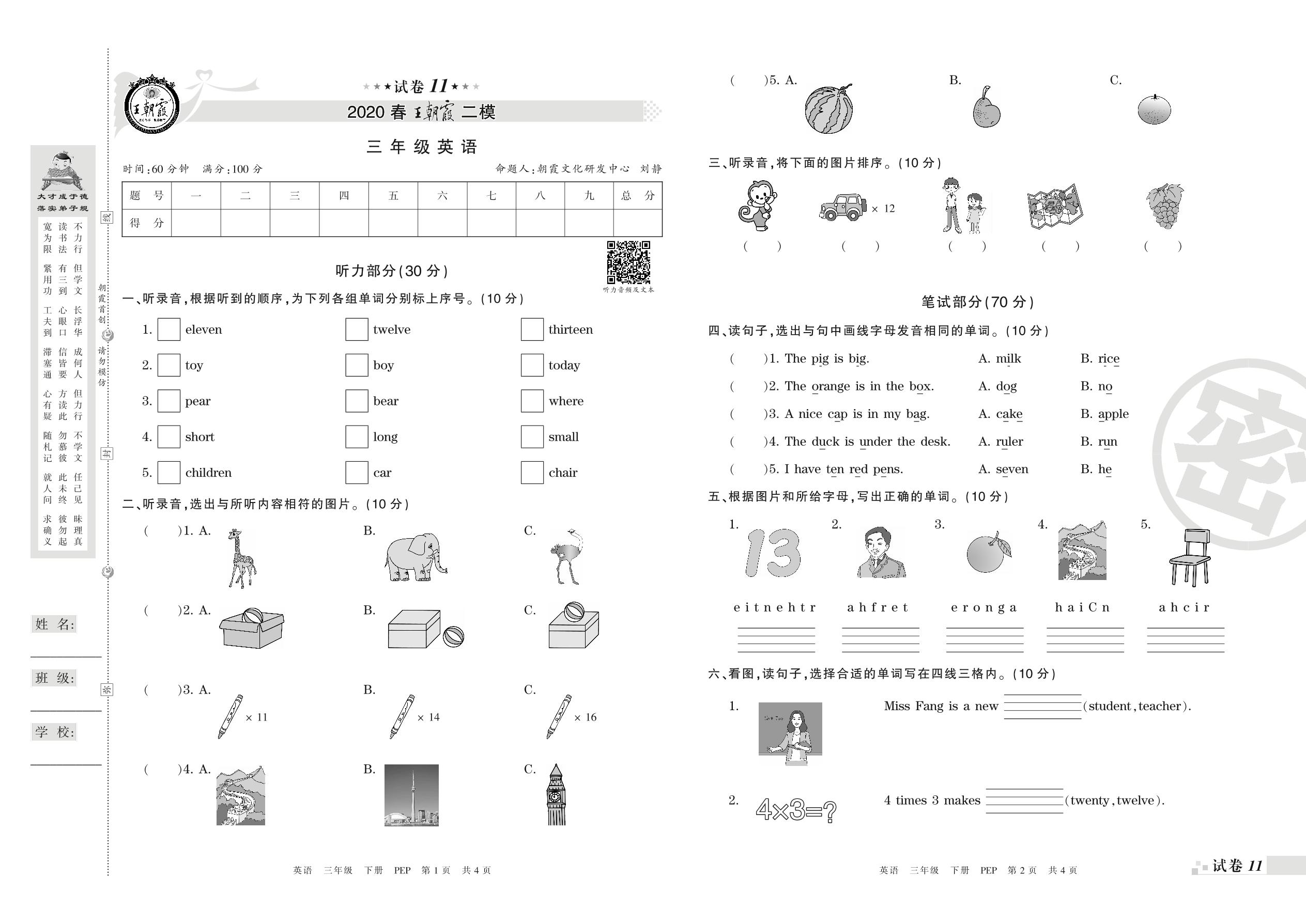 王朝霞期末模拟卷三年级下册英语(PEP版)_R21080792541【11】