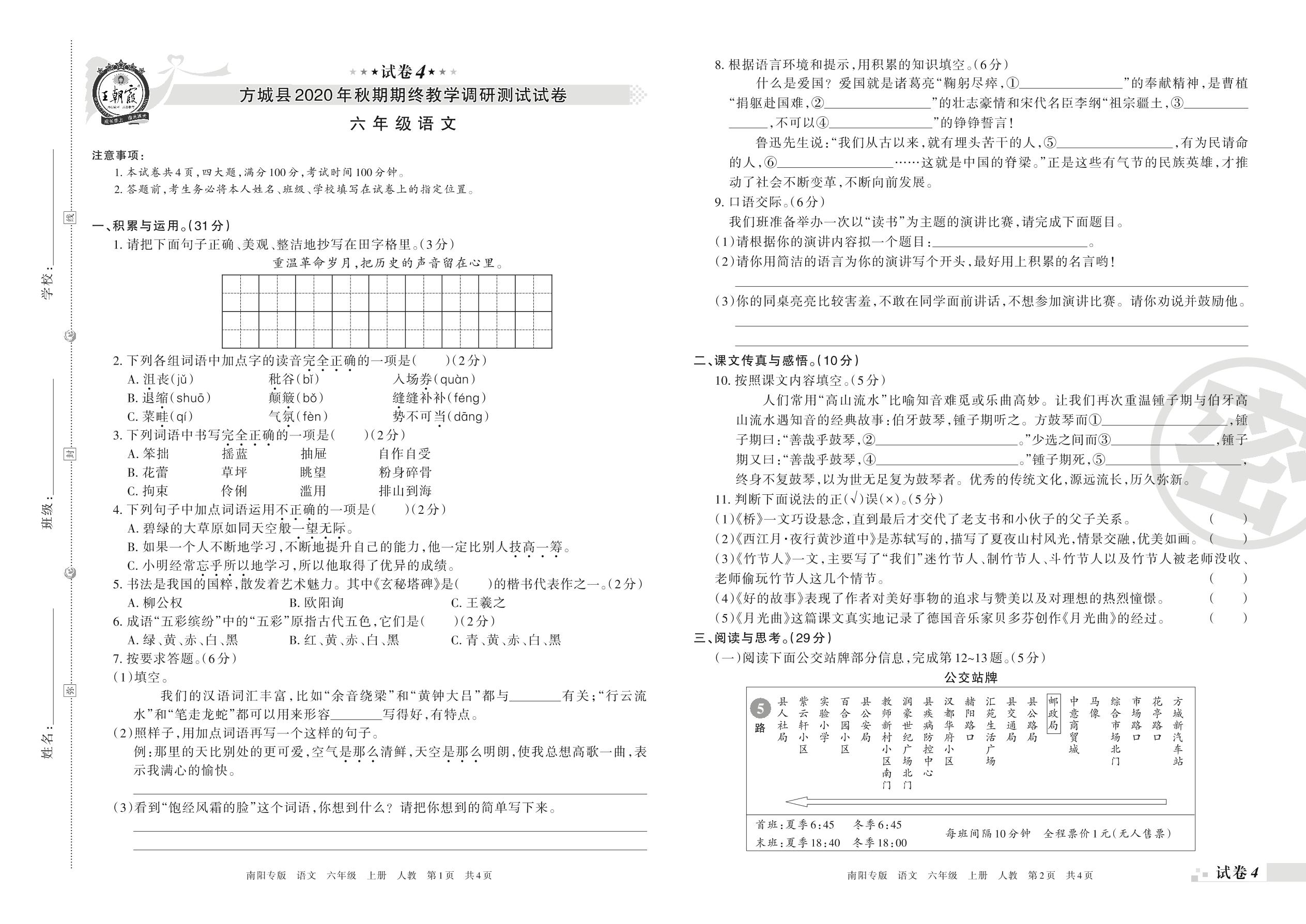 方城县2020年秋期期终教学调研测试试卷六年级语文(人教版)【4】