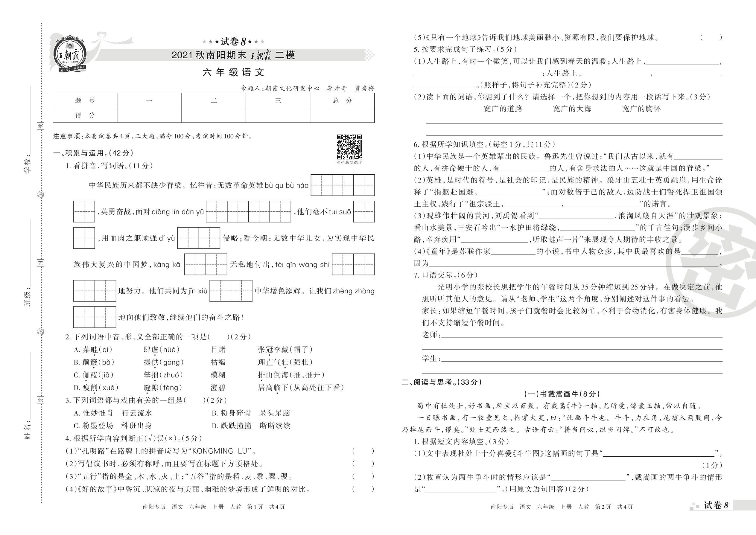 王朝霞期末模拟卷六年级上册语文(人教版)_R211224174134687【8】