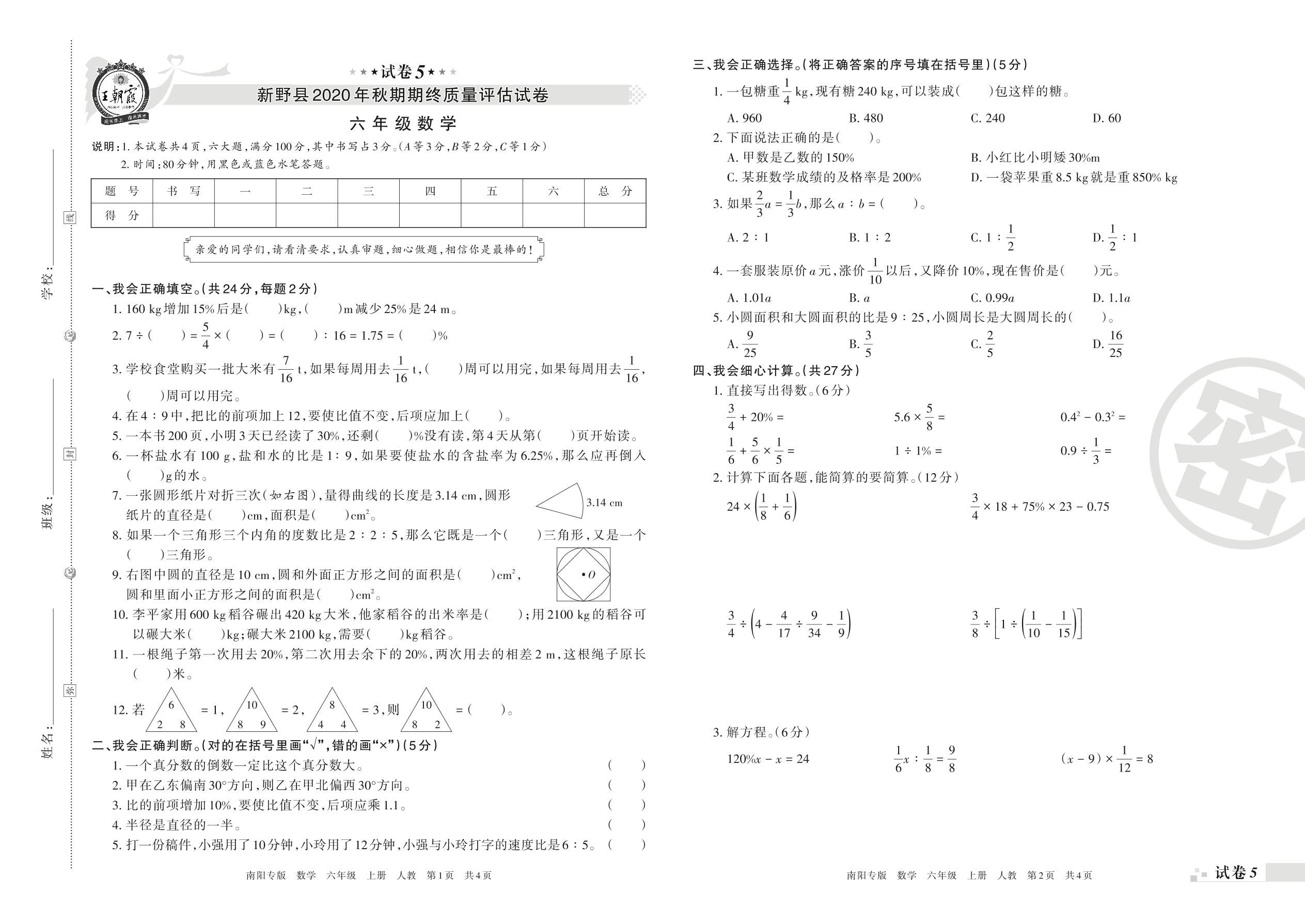 新野县2020年秋期期终质量评估试卷六年级数学(人教版)【5】