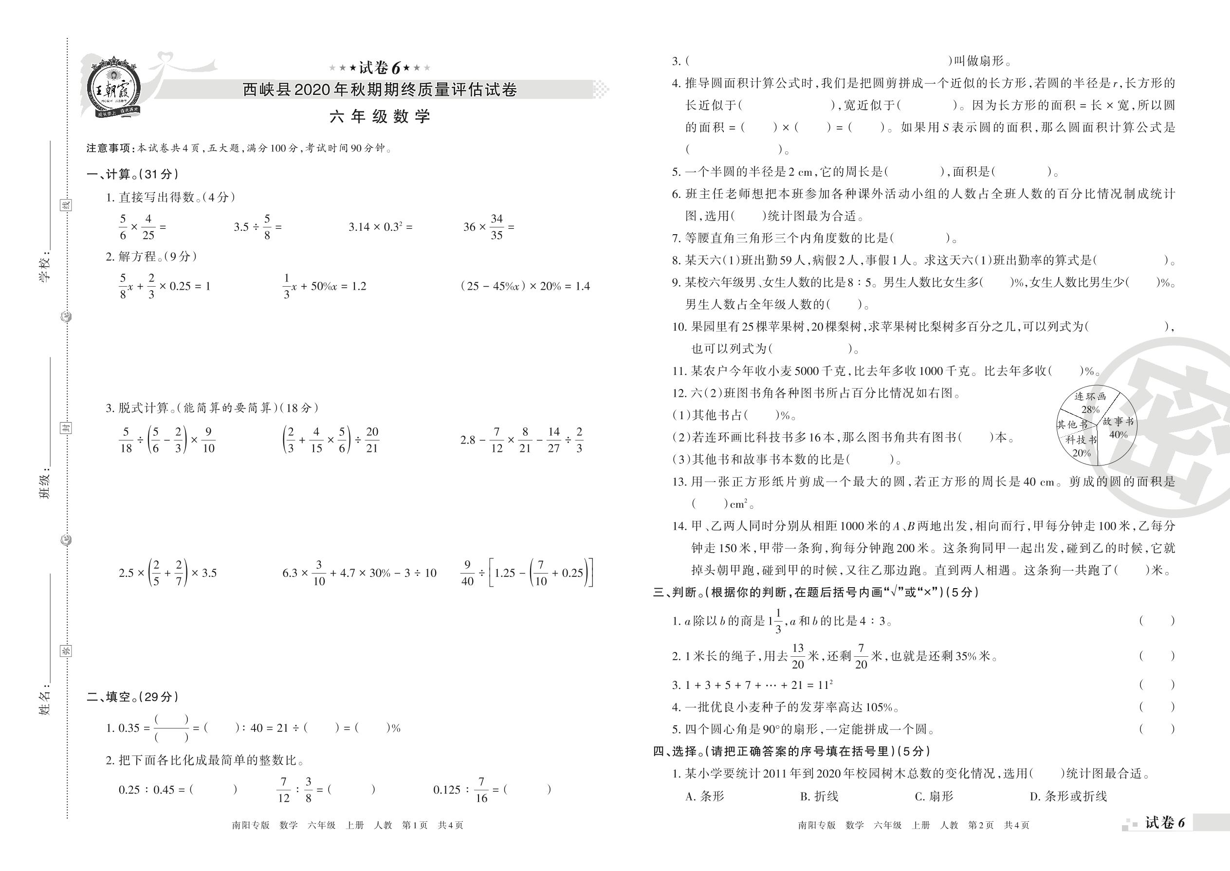西峡县2020年秋期期终质量评估试卷六年级数学(人教版)【6】
