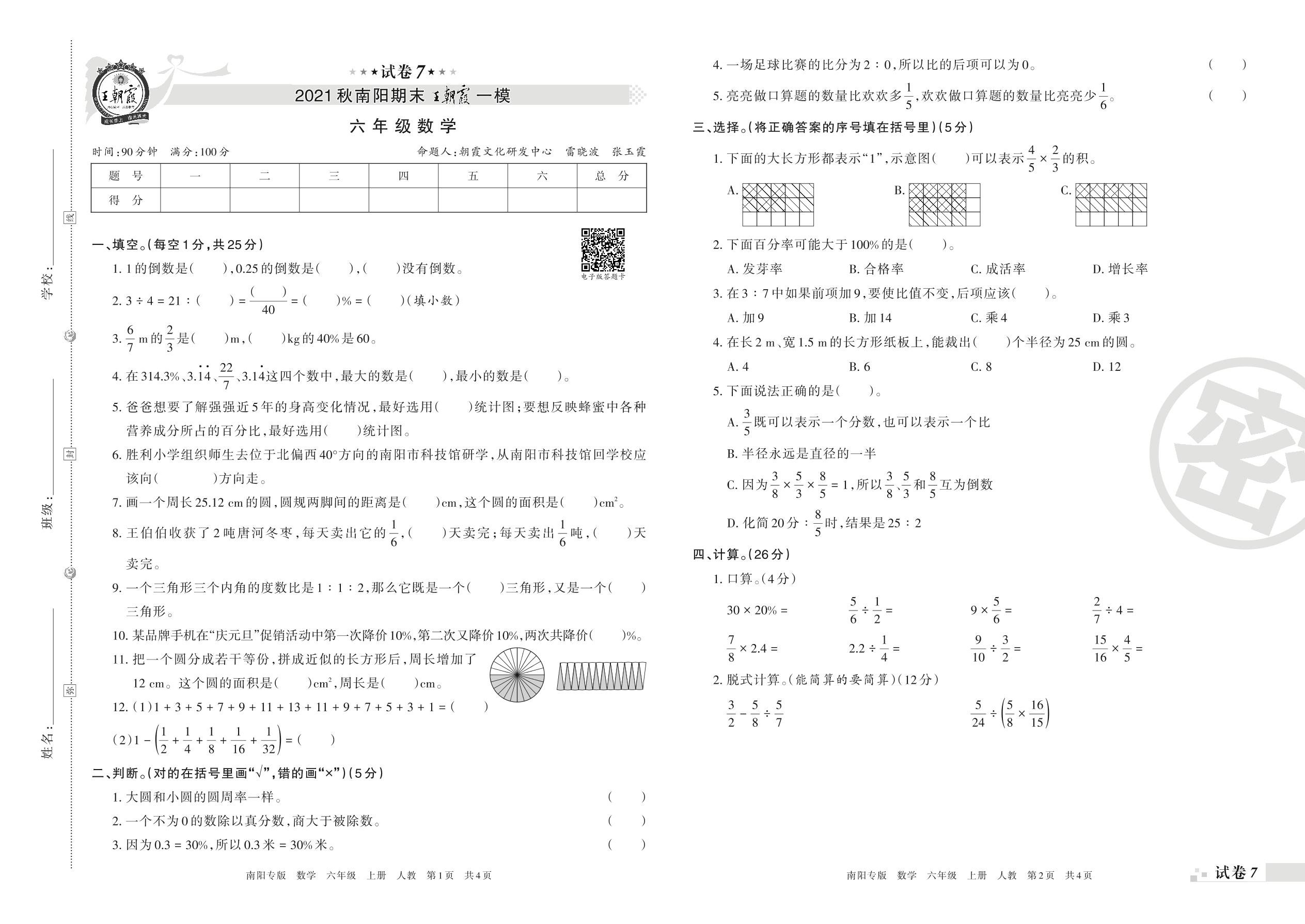 王朝霞期末模拟卷六年级上册数学(人教版)_R211225085350082【7】