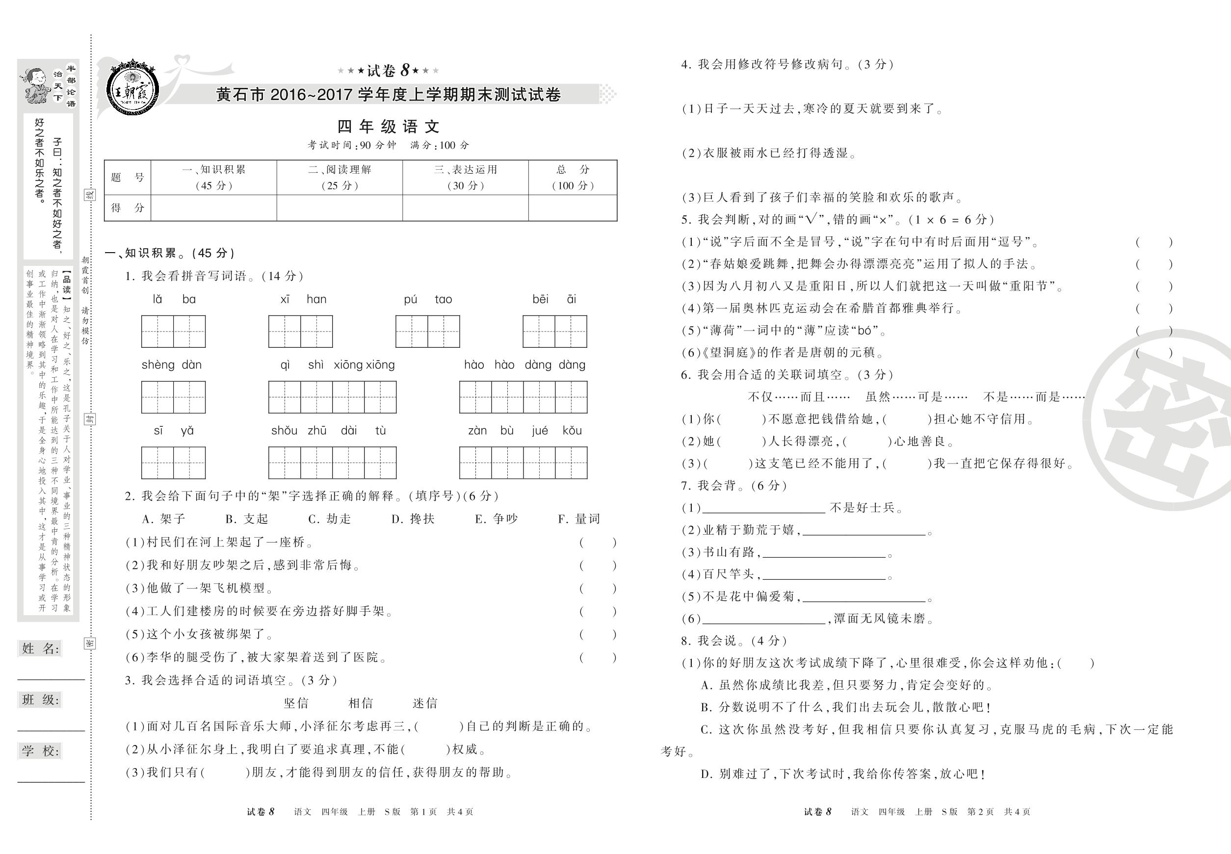 2016-2017学年第一学期黄石市四年级语文试卷(S版)【8】