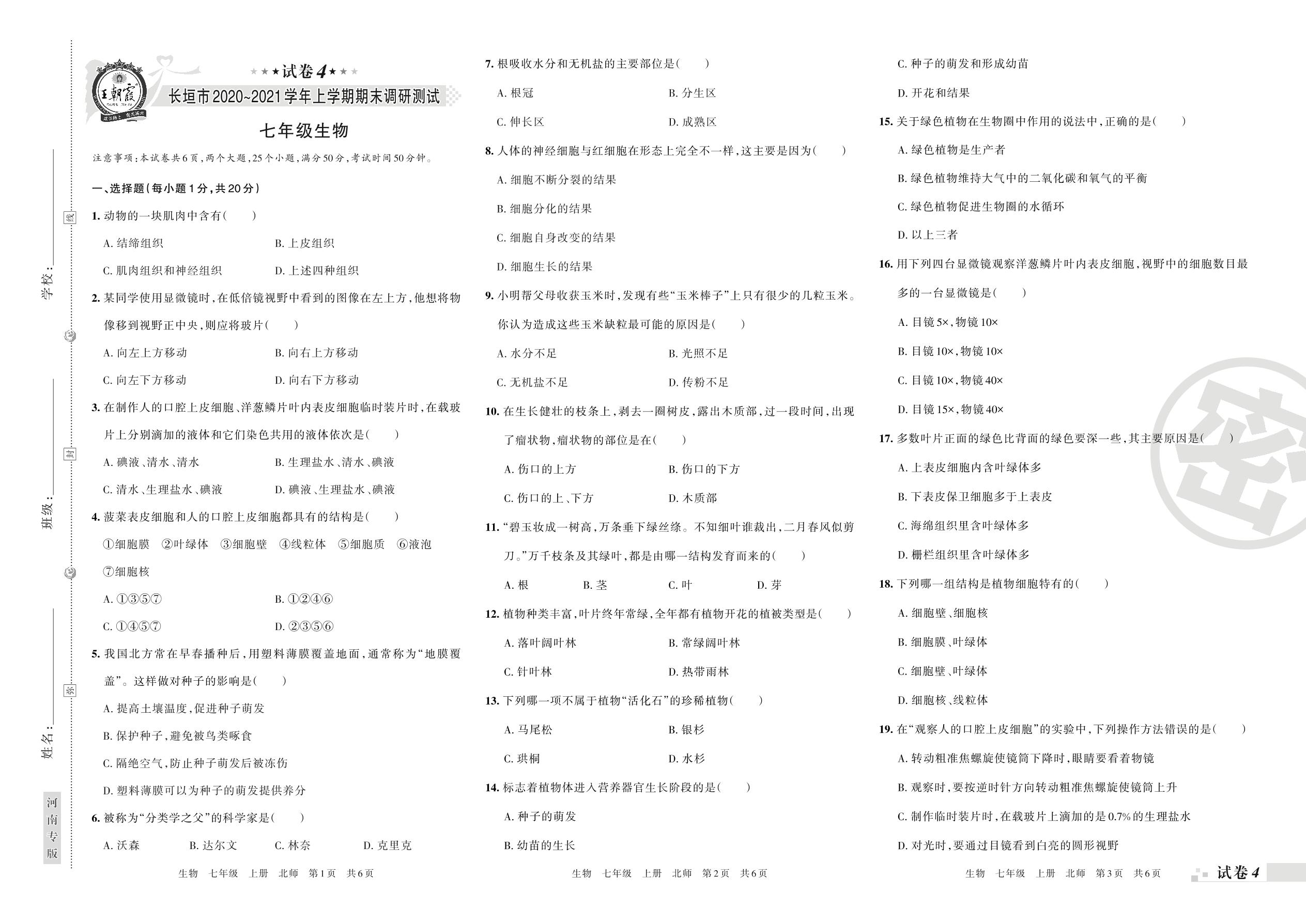 长垣市2020~2021学年上学期期末调研测试七年级生物(北师版)【4】