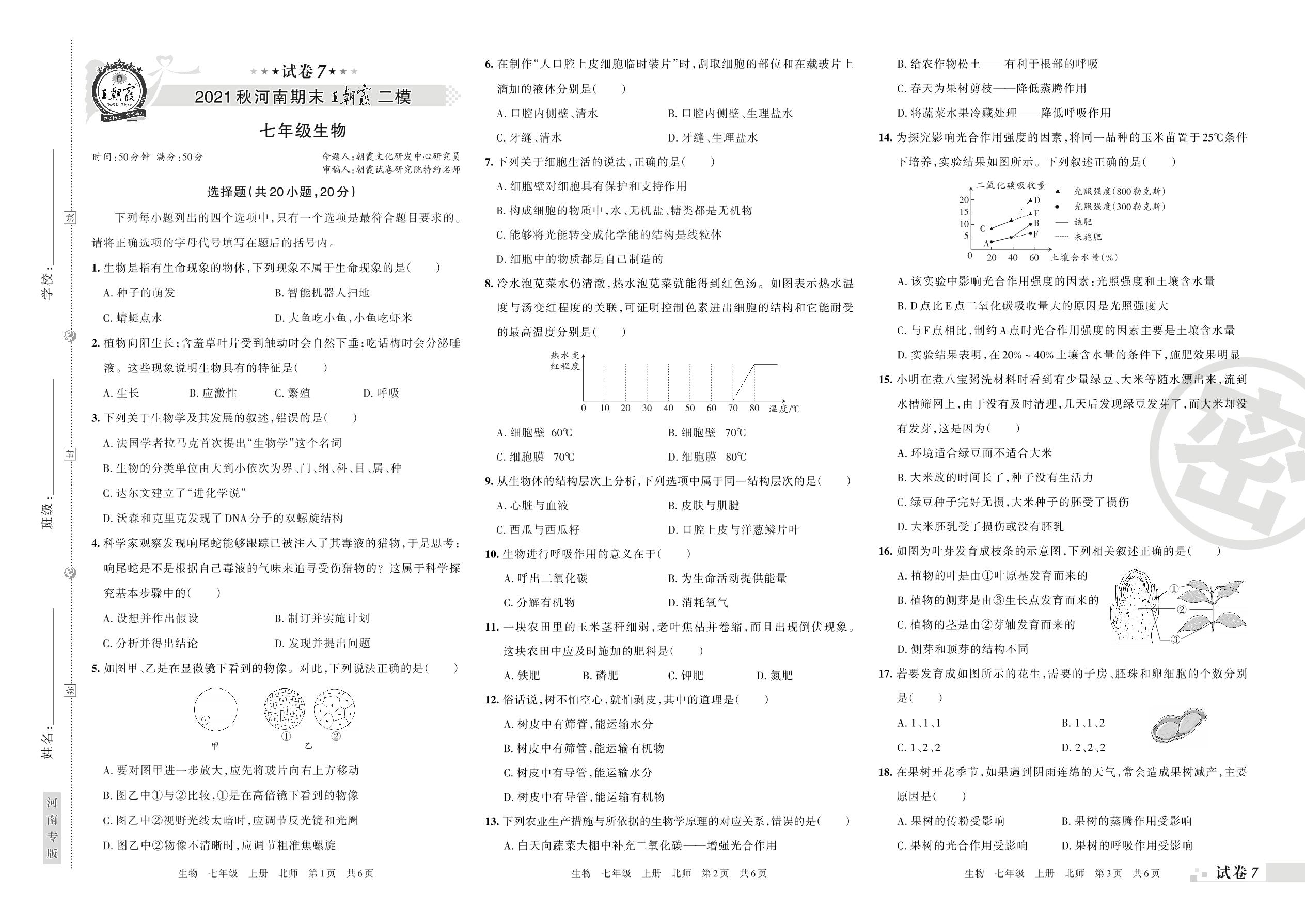 王朝霞期末模拟卷七年级上册生物(北师版)【7】