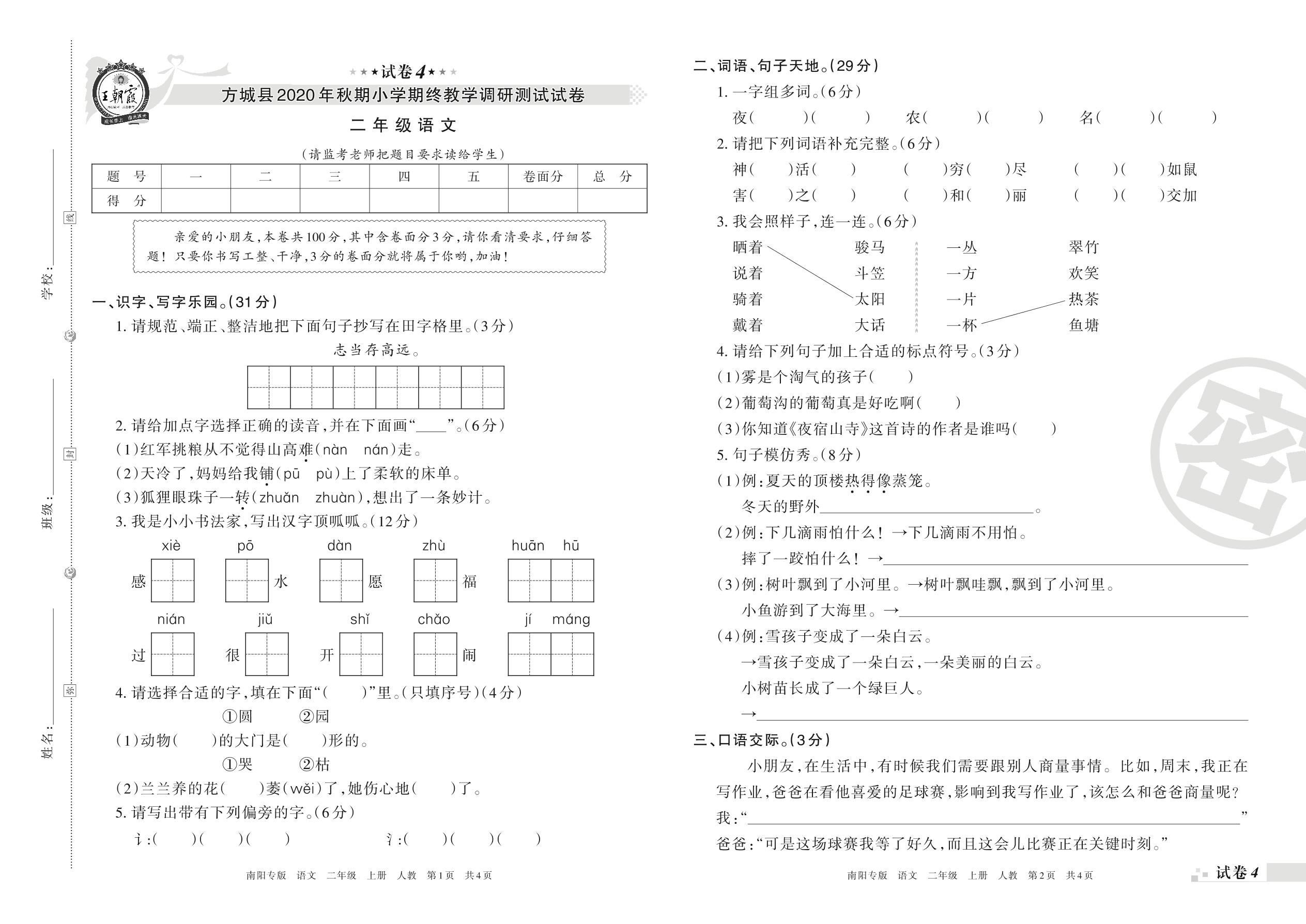 方城县2020年秋期小学期终教学调研测试试卷二年级语文(人教版)【4】