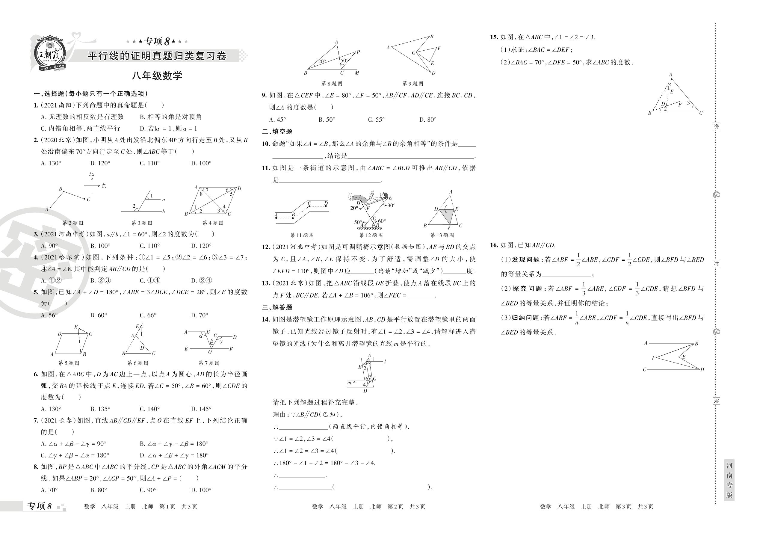 王朝霞期末专项卷——平行线的证明真题归类复习卷八年级上册数学(北师版)_R211225091029666【8】