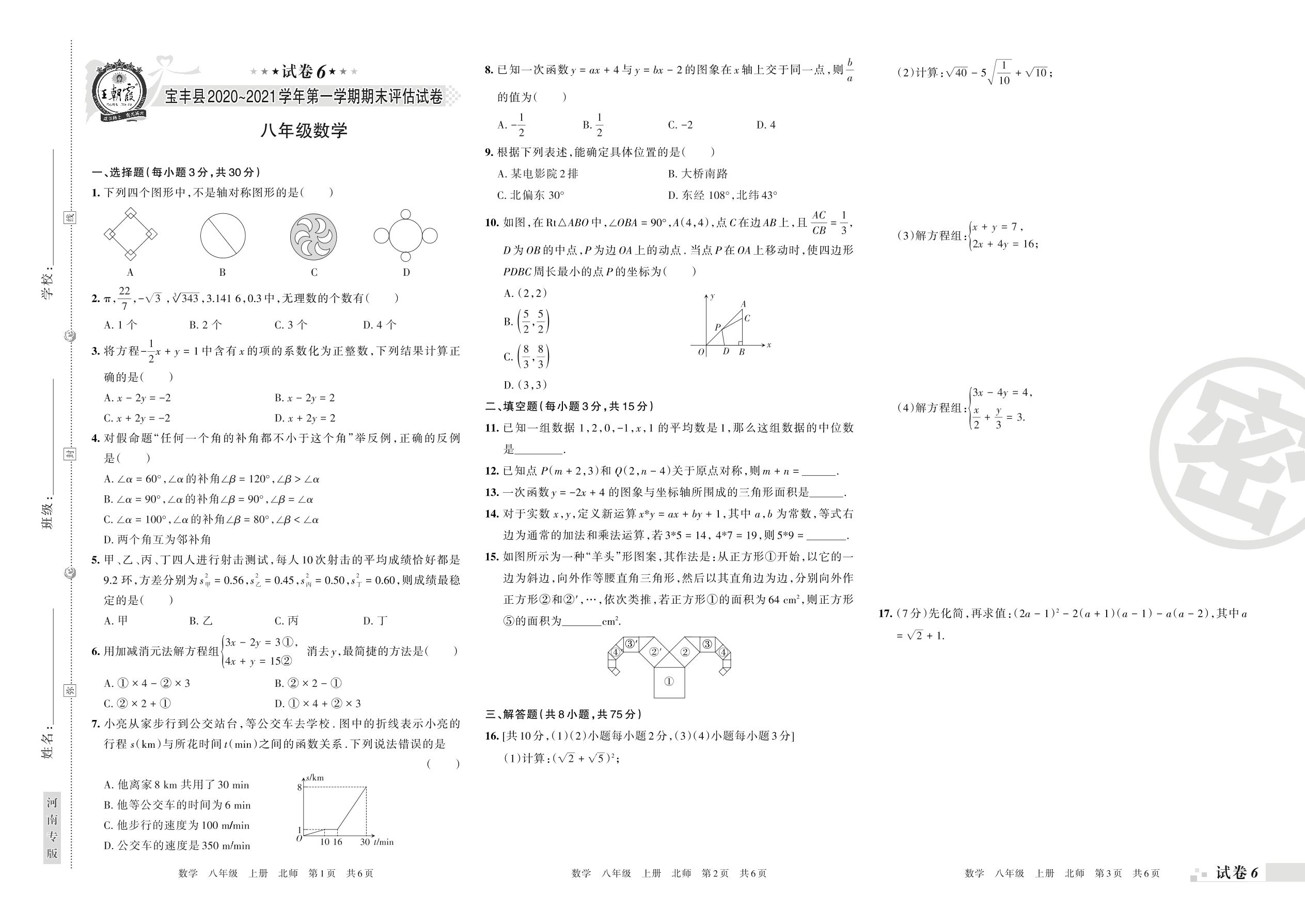宝丰县2020~2021学年第一学期期末评估试卷八年级数学(北师版)【6】