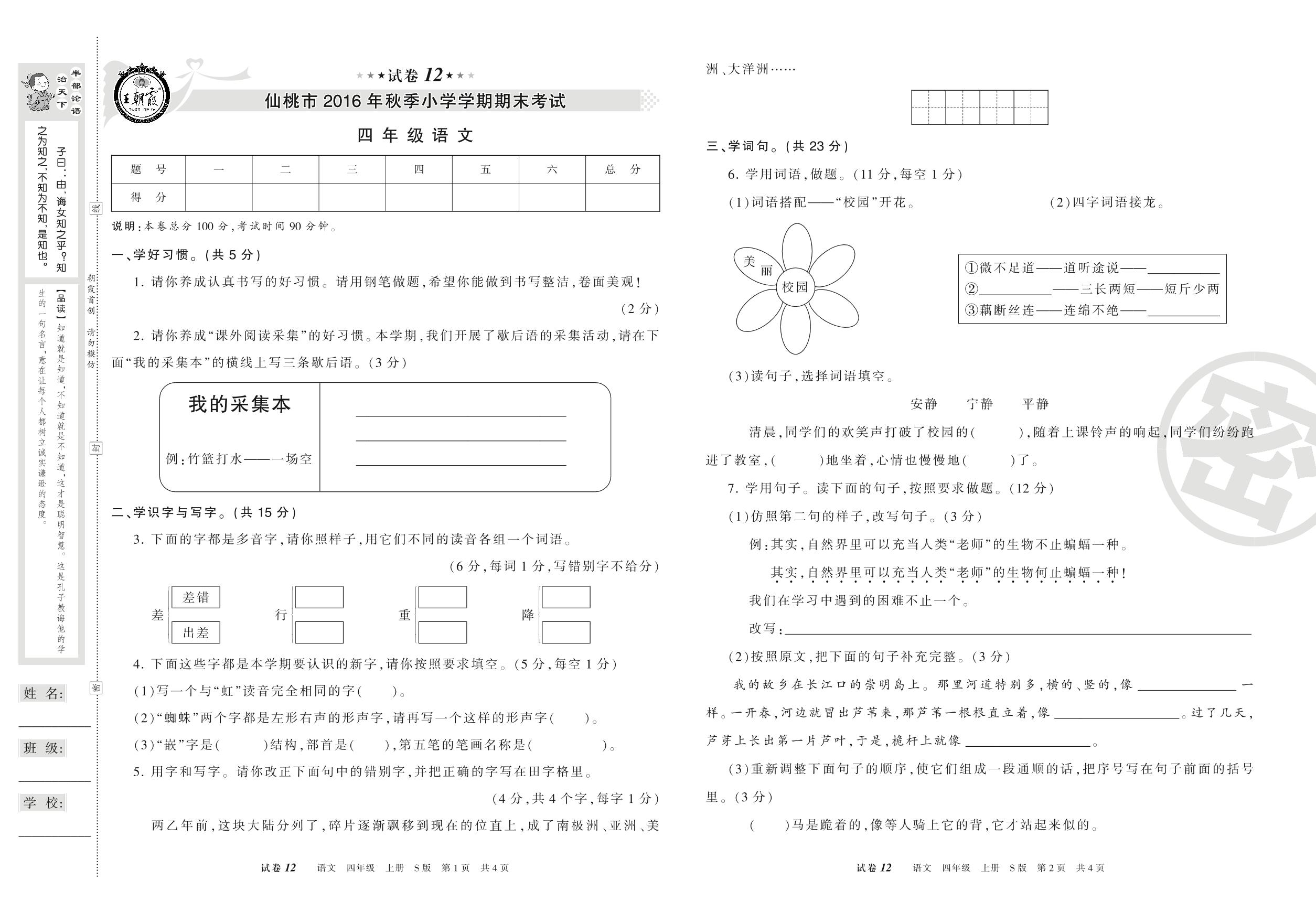 2016-2017学年第一学期仙桃市四年级语文试卷(S版)【12】