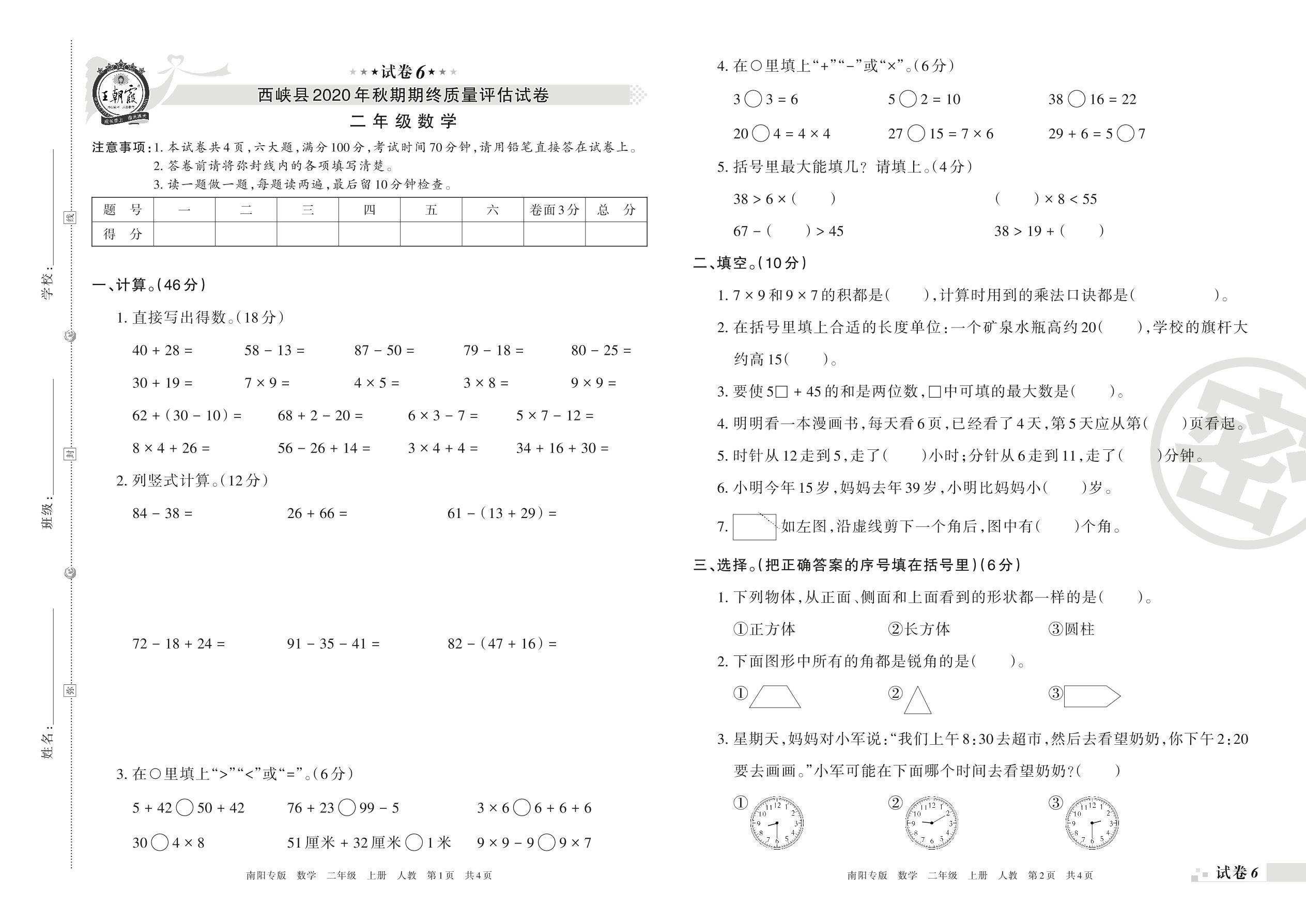 西峡县2020年秋期期终质量评估试卷二年级数学(人教版)【6】