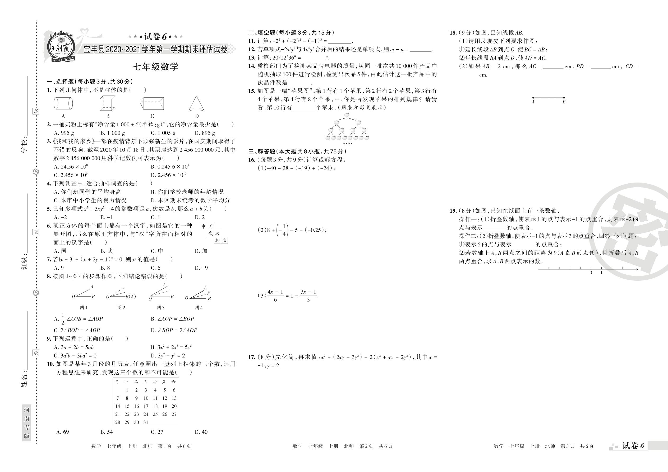 宝丰县2020~2021学年第一学期期末评估试卷七年级数学(北师版)【6】