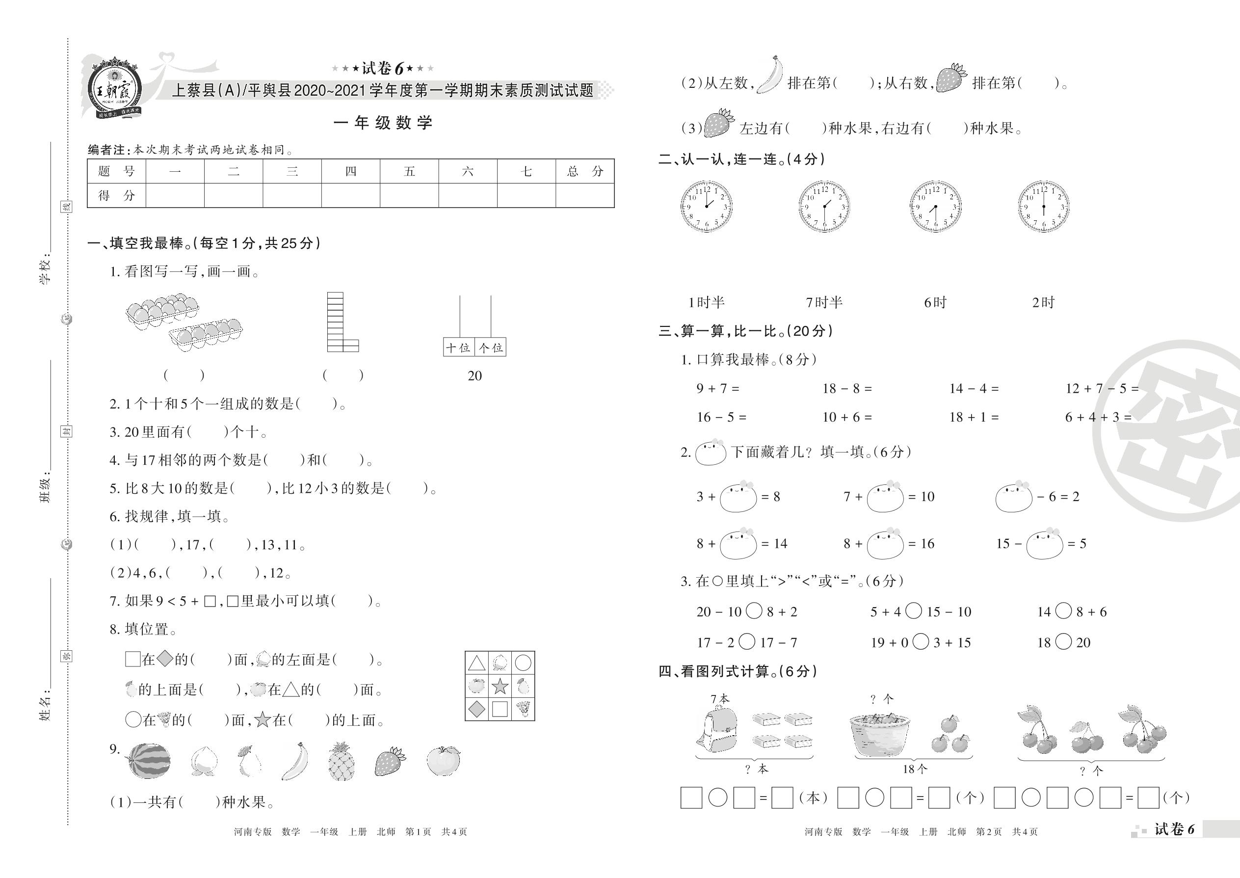 上蔡县(A)、平舆县2020~2021学年度第一学期期末素质测试试题一年级数学(北师版)【6】