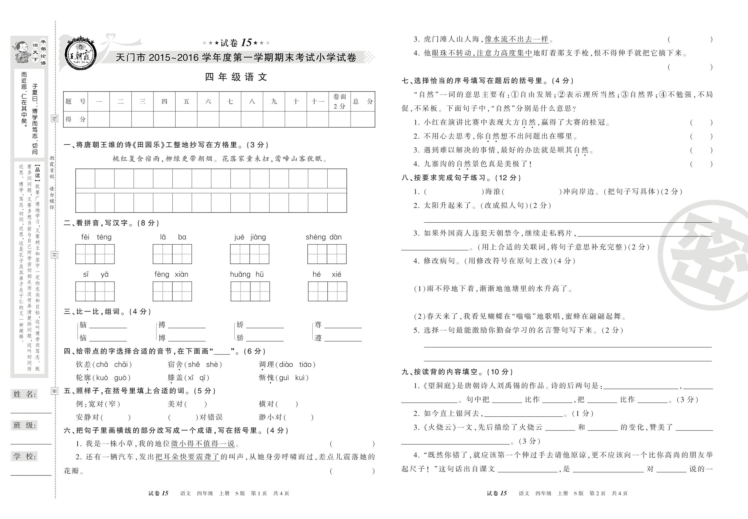 2015-2016学年第一学期天门市四年级语文试卷(S版)【15】
