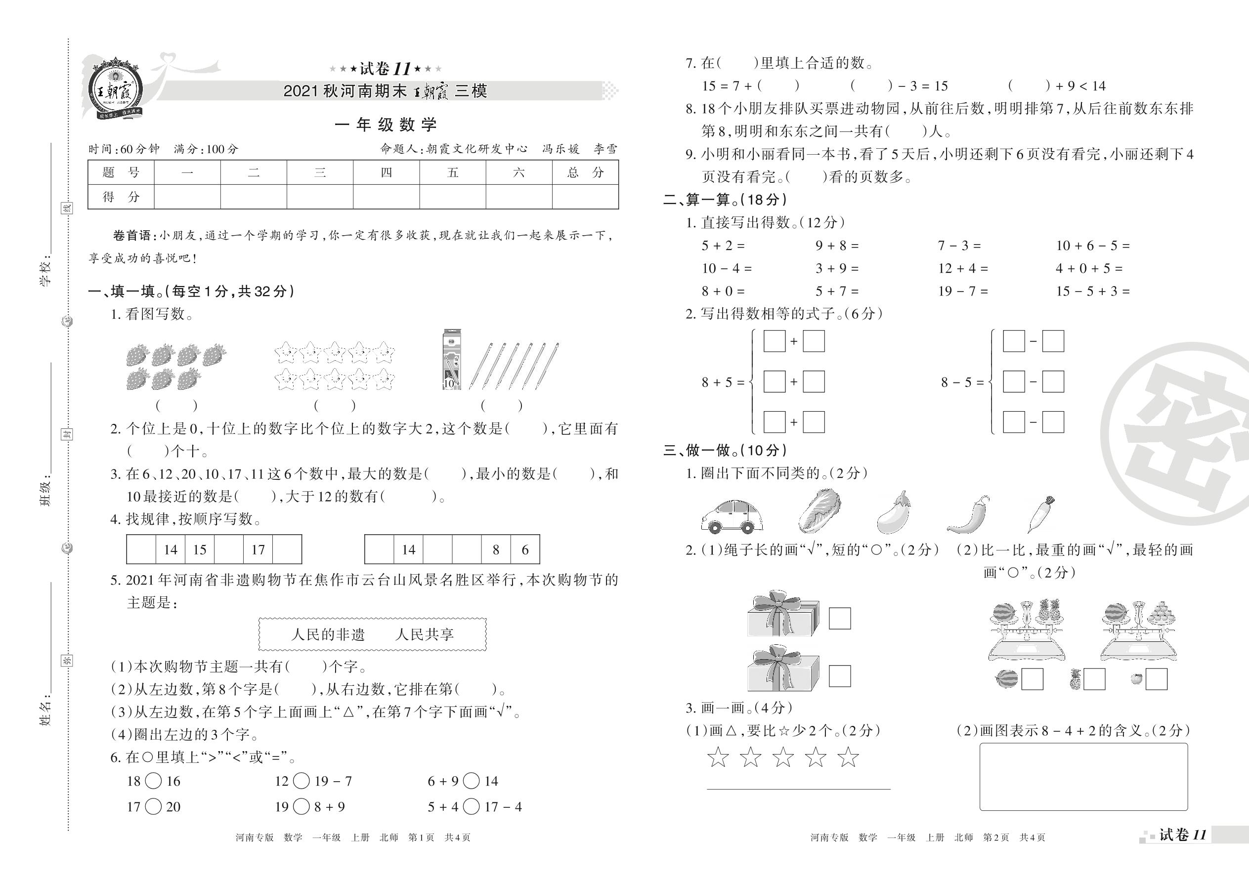王朝霞期末模拟卷一年级上册数学(北师版)【11】