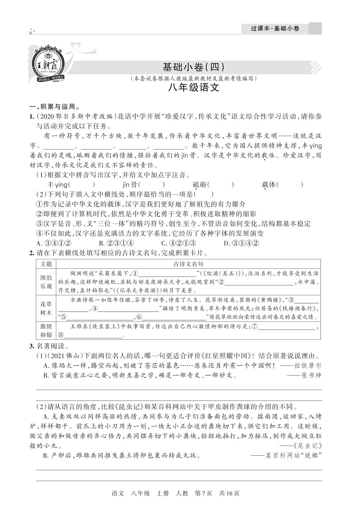 王朝霞期末过课本——基础小卷(四)八年级上册语文(人教版)_R211225092221953【10】