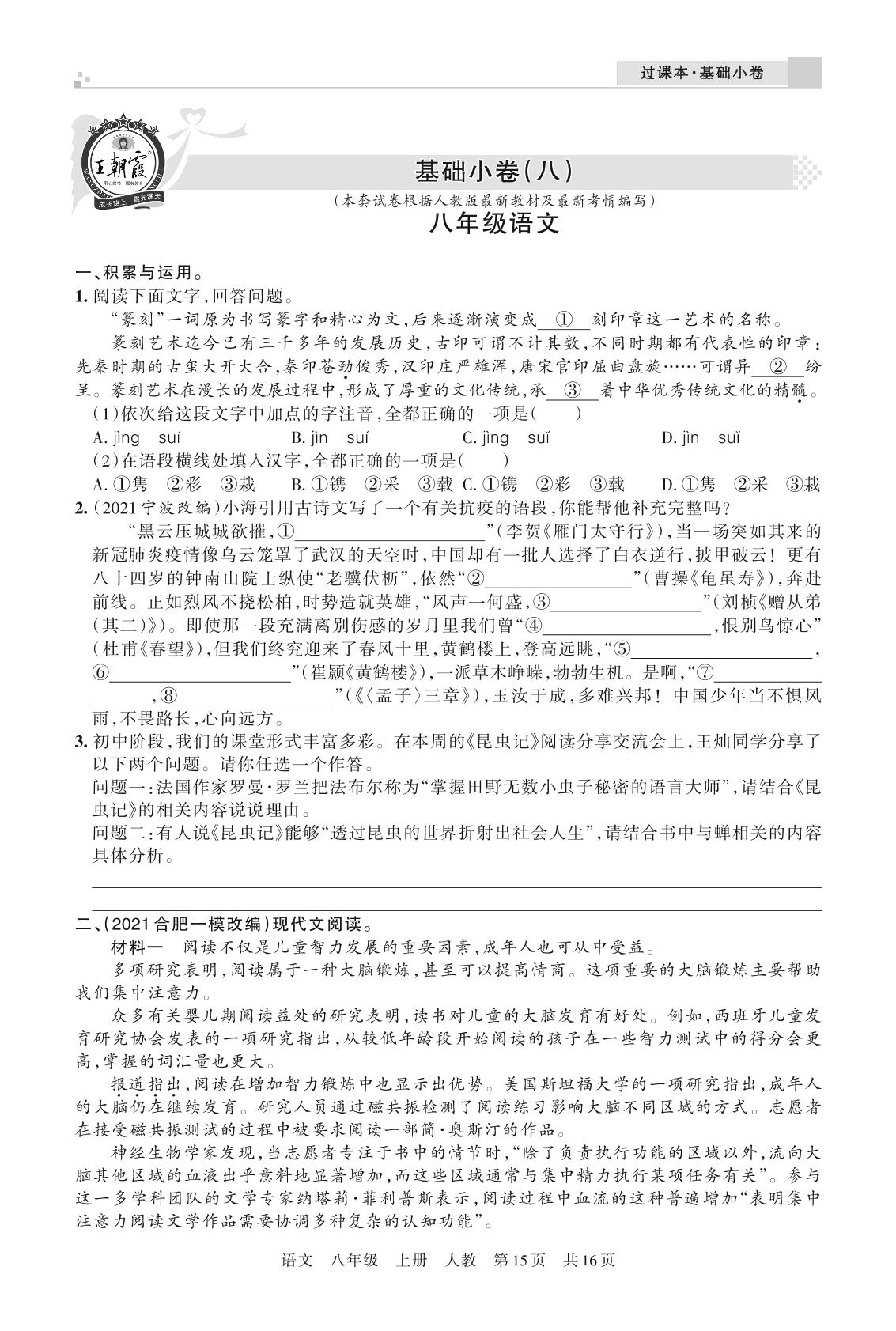 王朝霞期末过课本——基础小卷(八)八年级上册语文(人教版)_R211225092221750【14】