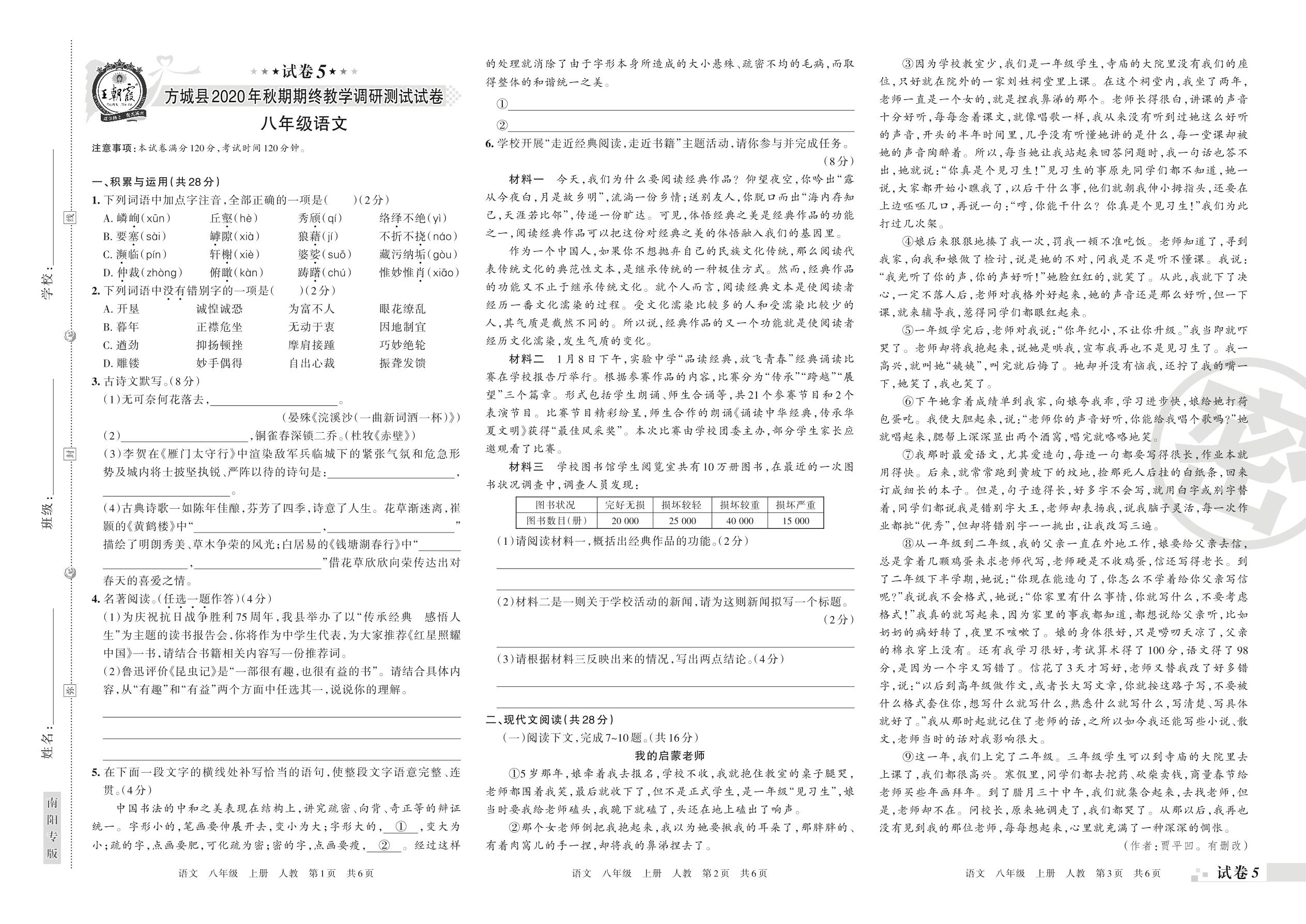 方城县2020年秋期期终教学调研测试试卷八年级语文(人教版)【5】