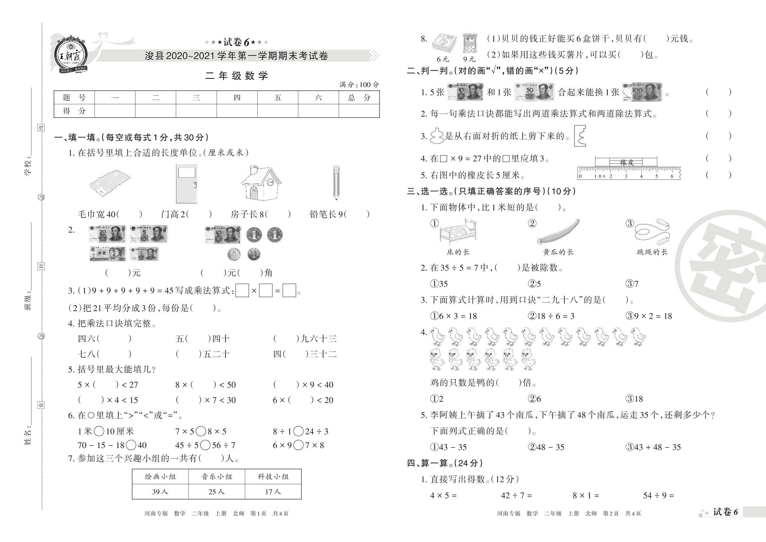 浚县2020~2021学年第一学期期末考二年级数学(北师版)【6】