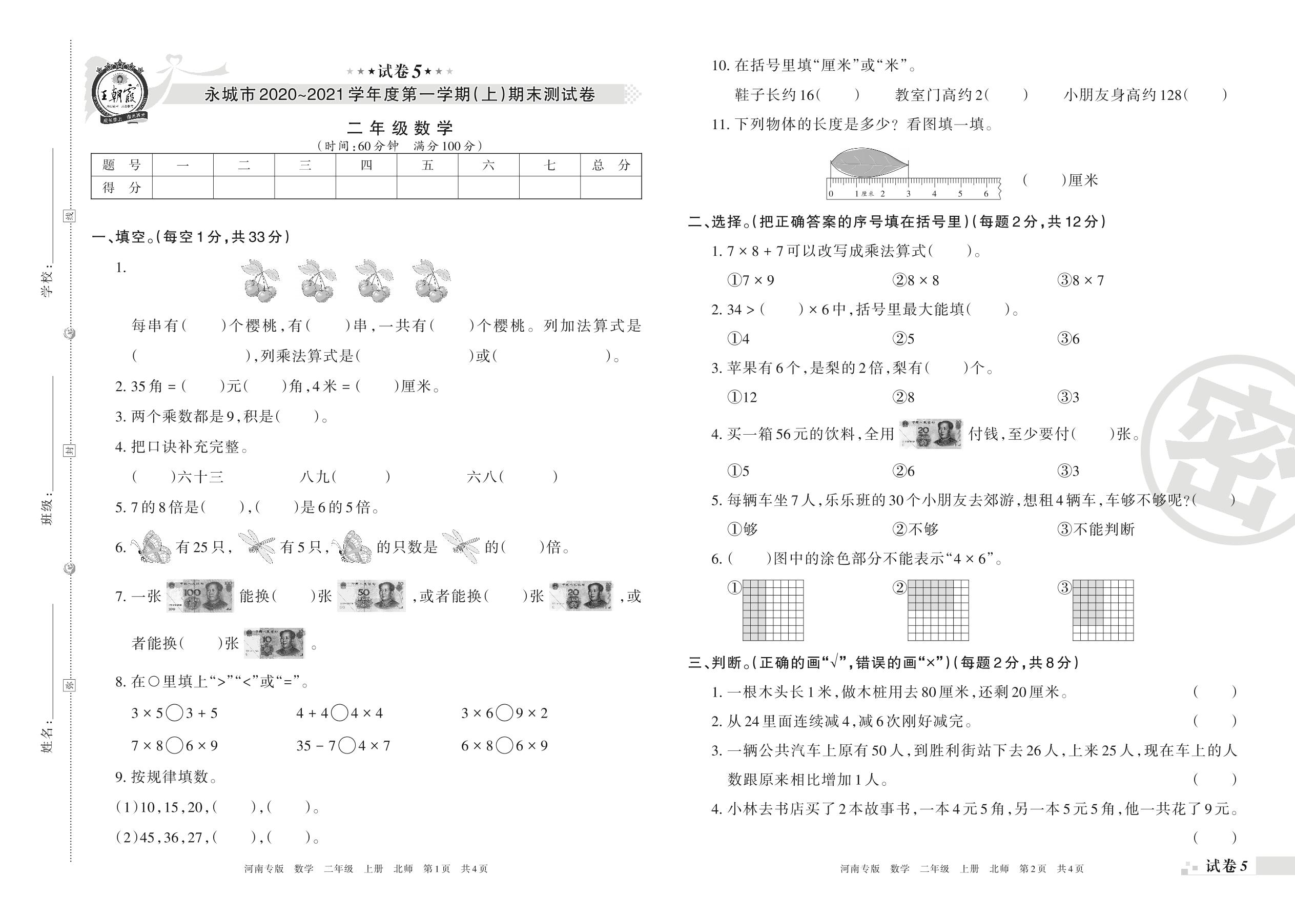 永城市2020~2021学年度第一学期(上)期末测试卷二年级数学(北师版)【5】