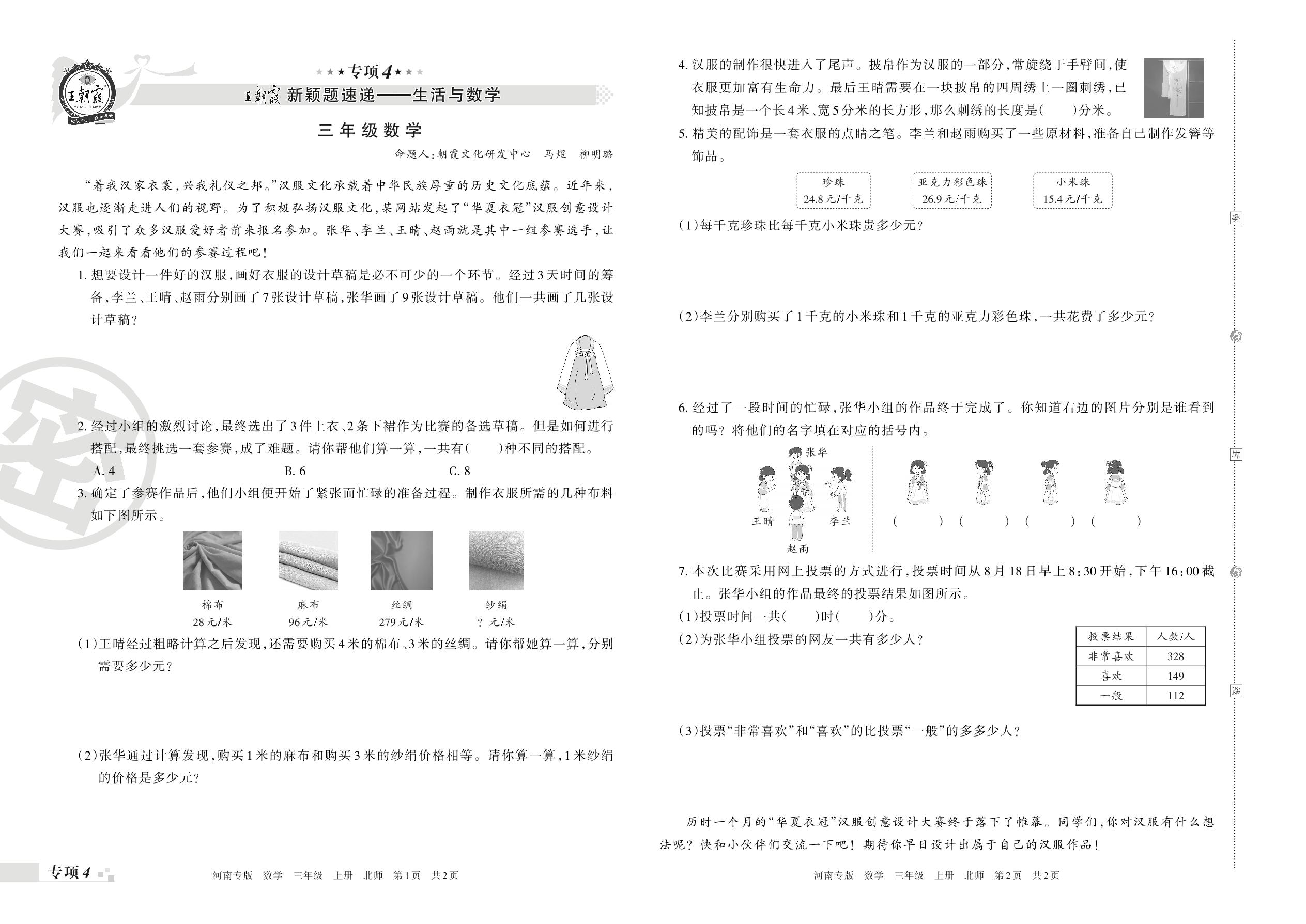 王朝霞期末专项卷——新颖题速递:生活与数学三年级上册数学(北师版)_R211225092746172【4】