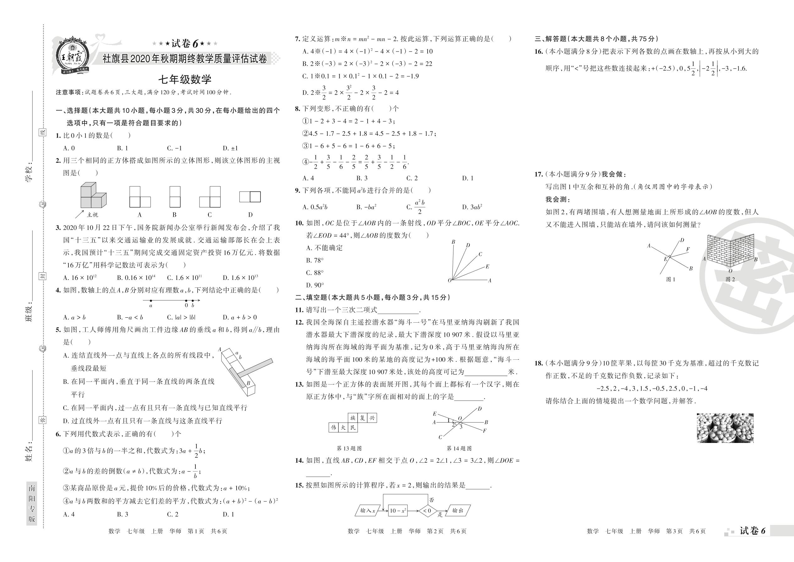 社旗县2020年秋期期终教学质量评估试卷七年级数学(华师版)【6】